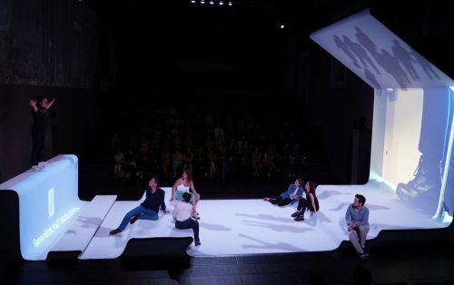 Un long et large ruban blanc, rythmé par des plis, des plateaux, des reliefs, des creux, recourbé à ses extrémités, pointant l’infini, traverse le public rangé de part et d’autre. Cet espace est matériel, élément de jeu où les corps dérivent, s’échouent ou ricochent tels des galets charriés par une force qui les dépasserait, mais tout autant immatériel, allégorique, semblable au rouleau d’un immémorial volumen déroulé sous nos yeux. Quelques ombres humaines le parsèment. Cohorte des justiciables s’écoulant dans le couloir temporel des pas perdus. Affaires familiales convoque ceci in medias res par un puissant synthétisme : une mise en tension du réel et de sa normalisation à travers la loi. C’est de ce conflit que naît le drame théâtral (comme il naquit avec Antigone à l’Antiquité).
