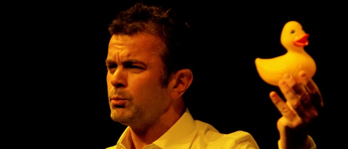 Le sel du spectacle de Frédéric Ferrer repose sur le plaisir que prend le comédien à garder pendant l’heure du spectacle un pied dans la science et un pied dans le jeu. Distillant ses impressions et ses imprécisions avec méthode, il ne sort jamais de son double rôle, et garde l’attitude parfois hilarante du scientifique exalté ou du comédien enthousiaste. Navigant toujours sur la crête de l’humour et de la science, on se demande parfois si Frédéric Ferrer n’est pas plutôt un scientifique déguisé en comédien tant on prend plaisir à suivre ses schémas et ses cartographies de canards en plastique. La découverte de cette histoire est en tout cas aussi réjouissante que l’art du décalage parfaitement maitrisé de David Ferrer. On attend avec impatience ses autres morceaux de bravoures scientifiques.