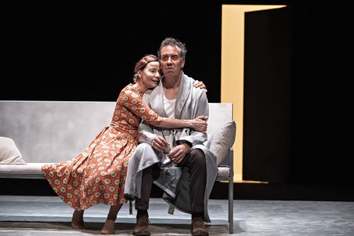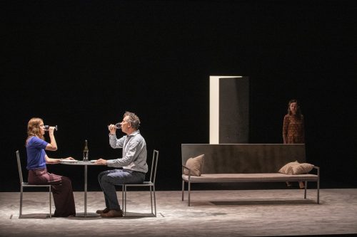 On ne peut pas vraiment dire que Et jamais nous ne serons séparés de Jon Fosse, prix Nobel de littérature en 2023, est un spectacle qui touche. Ce serait un mensonge. Il perd, nous perd, déchire, nous déchire. Une femme seule, parle à un homme, qu’elle attend, le dîner est prêt, la table est mise mais il n’est pas là, pas encore. Régulièrement, la porte s’ouvre et dans la lumière cet homme apparaît, presque muet, silhouette immense qui répond à peine aux questions de cette femme. Il disparaît, revient, la femme s’interroge toujours, sur le passé, le présent ? Demain ? Une relation qui a été, est, sera, aurait pu être ? Comment le savoir exactement ? Puis l’homme se pose lui aussi des questions, la ronde continue puisqu’une seconde femme, plus jeune, les « rejoint ». Qui est-elle ? Une autre ou la même quelques années auparavant ? Le fruit du mensonge ou une image ? Tous se torturent lentement, dans le vide, dans l’interrogation. C’est surtout la toute première qui parle, souriante, sûre, puis l’inverse et on recommence. Sur le couple, l’amour, sur toi, sur moi, affirmations multiples, peurs et contraire pour faire comme si la vérité était détenue.