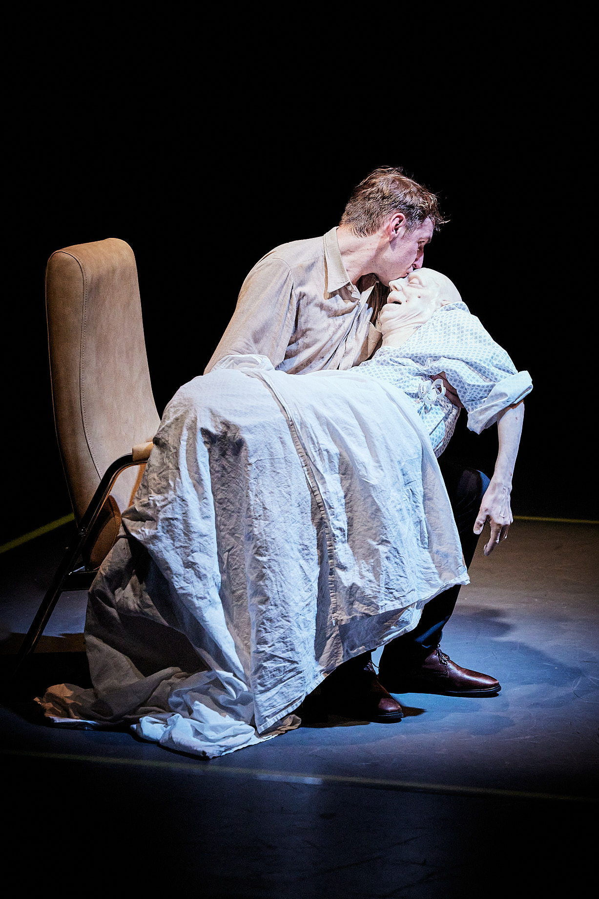 Flesh débute avec And Yet, qui se déroule à l’hôpital. Un fils (probablement) va visiter son père mourant. La moitié de la pièce constitue en la préparation « physique » de la visite, qui se passe en effet efficacement de paroles : répondant aux injonctions gestuelles d’une aide-soignante, le jeune homme voit se succéder moult ablutions au gel hydroalcoolique avant et après avoir enfilé combinaison, masque chirurgical, lunettes de protection, gants dont l’étanchéité avec les manches est assurée par du gros scotch transparent. La scène est très comique car elle résonne évidemment avec les actions nouvellement apprises et répétées depuis deux ans par chacun de nous, gestuelles pour une part devenues automatiques et qui ont perdu leur étrangeté initiale. La paradoxale humanité de certains gestes des soignants (une main délicate sur l’épaule d’un patient qui dort pourtant) alliée à la mécanisation qui prend imparfaitement le relais (personne ne vient jamais immédiatement quand on actionne la fameuse sonnette accrochée au lit du patient lorsque le moniteur s’affole et que le visiteur panique) sent (affreusement) le vécu… Mais quand le besoin de toucher, entourer les corps aimés, se voit entravé par les branchements et autres obligations, la seule solution est de passer outre les règles et faire corps avec l’être à protéger et inverser s’il faut l’ordre des choses en prenant son père dans les bras. La première pièce en fait une démonstration tristement réussie.