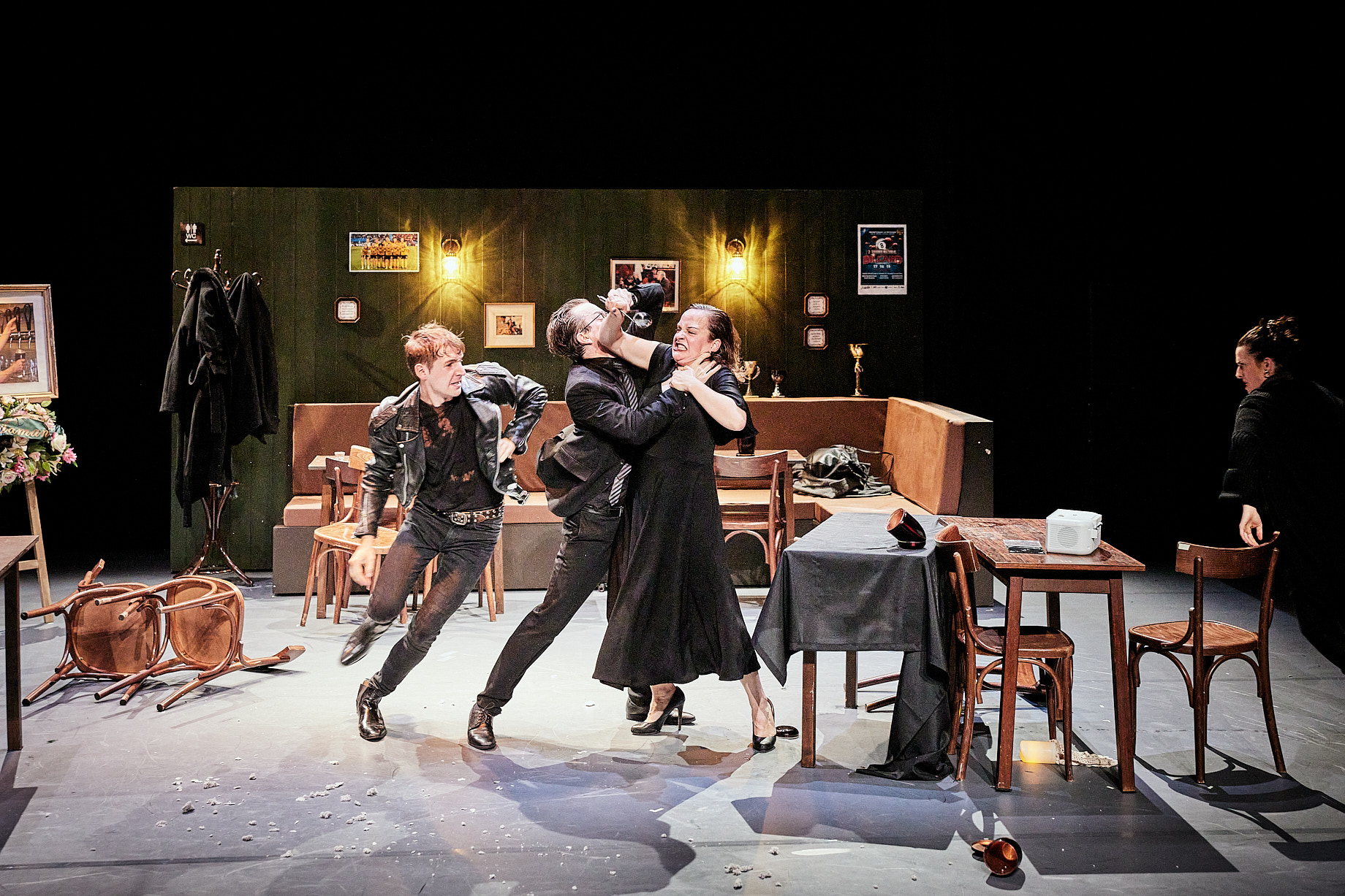 Empêchés de présenter No one en 2020, les deux auteurs, metteurs en scène et comédiens belges présentent en cette 76ème édition du In quatre nouvelles pièces courtes, qui tiennent dans un format total de 85 minutes, dans un espace scénique aux dimensions assez réduites, et dont les transitions se font au moyen d’un rideau noir savamment éclairé qui encadre en carré les changements de décors. Se succèdent des univers réalistes forts différents, mais qui vont tous engager avec intensité les corps des personnages, ou plutôt leur chair si l’on veut rester fidèle au titre général du spectacle, car le titre est en anglais, comme ceux de chaque pièce et le nom de la compagnie (Still Life). So what ?