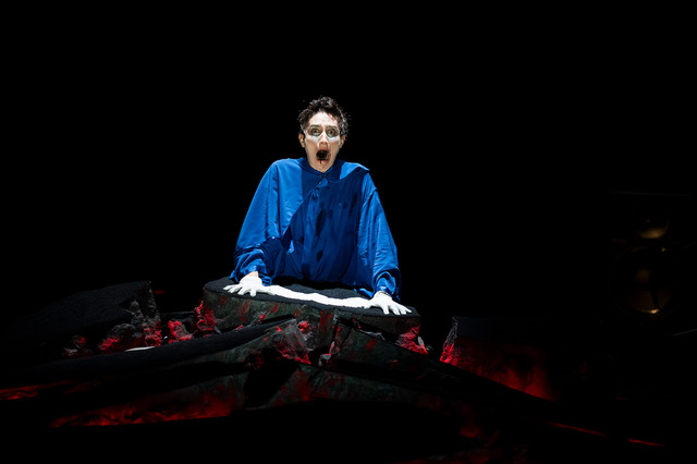 Un monticule rougeoyant, lit de braise sous la cendre. Dessus, cuisses et jambes blanches, comme accroupies. Je pense : quelques traits de craie d’un Degas croquant la toilette d’une danseuse. L’image fugitive s’efface dans l’envahissement d’un inextinguible cri étouffé. Le crépitement d’une respiration sonore et crachotante emplit tout, me projette dans de lointaines steppes où le vent parle aux humains. Si le son délie la pensée, la contemplation d’un visage gommé par l’obscurité dont ne resteraient qu’une bouche ouverte et des yeux rougeoyant du même enfer que celui qui brûle sous ce corps, sidère. Ce qui a lieu suinte l’étrangeté par ces reflets contredisant les lois de l’optique et de la physique. Sur naturel. Les petits miroirs obstruant sur ce visage la bouche, faisant lunettes, troublent, trouent le regard du spectateur. Comme pour la ventriloquie dans le champ du sonore, ils instillent dans le champ du visible une présence fantôme, une insoluble contradiction. De l’être et du paraître. De l’intériorité et de l’extériorité. Flora Détraz est une magicienne interrogeant par ses dispositifs l’illusion du vivant. HURLULA s’annonce au croisement du hurlement et du ululement, sans doute faudrait-il aussi y voir une réminiscence de la Horla tant la chorégraphe travaille à un certain fantastique, qui résulterait d’un glissement du réel comme deux calques se décalant l’un par rapport à l’autre. Un déphasage. On est toujours au bord de quelque chose sans que cela soit raccord : un espace de doute dans nos représentations, un écart dans l’écoute, jouent de la fin des certitudes, nous font entrer dans les interstices d’un monde en transformation. Flora Détraz est une combinatoire presque lucrécienne d’atomes invisibles, s’assemblant, se reconstituant, par des concrétions, des projections, dans une suite d’apparitions : d’une chamane à une chanteuse de rock, en passant par une diseuse de bonne aventure, des oiseaux, et bien d’autres formes encore. Se glissant dans d’autres empreintes spectaculaires, dans d’autres manières d’être vivant, elle se révèle caméléon quand bien même se dessine une singularité et une acuité au fil de ses transformations. Si la scénographie de Nadia Lauro, inspirée des sols islandais, a tendance à refermer la performance par moment sur elle-même comme un nombril trop serré, elle dégage cette puissance symbolique faisant rimer les entrailles terrestres avec celles de Flora Détraz. Accompagnée de Claire Mahieux (larsens et conception son) et de l’impassible Lê Quan Ninh (percussions), HURLULA a la roublardise d’une chanson de geste où l’humain tend à se dissoudre dans le non humain. Accrochée aux entrailles de la Terre, œuvrant à une poésie qui invite à regarder ce qui a lieu sans en rien préjuger, Flora Détraz ne laisse pas de nous surprendre.