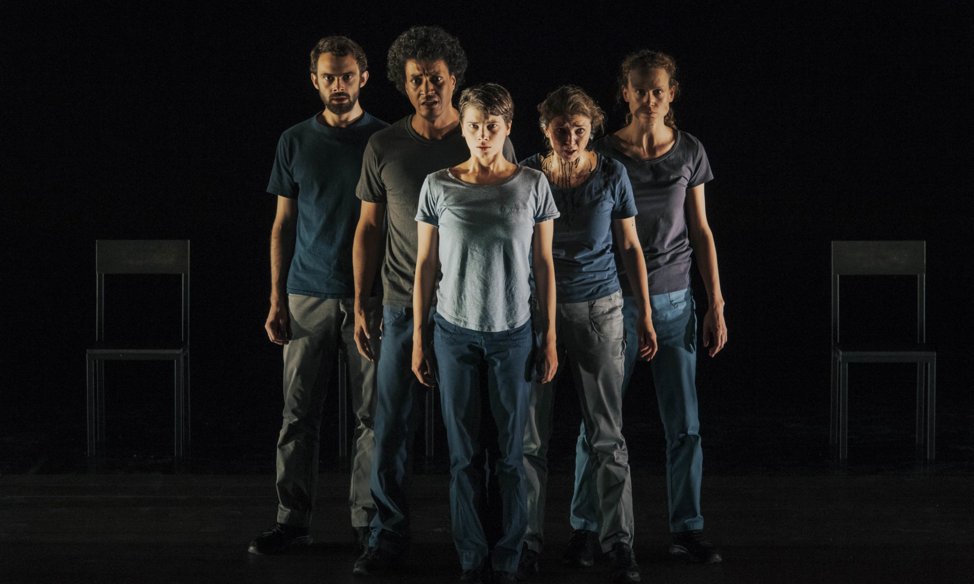 Les cinq comédiens tombent, rebondissent, ploient sous les vents contraires, reçoivent des sceaux d’eau, s’élancent, pleurent les morts, implorent les dieux, appellent leurs mères ; ils assument tous les rôles avec fluidité, cette souplesse est un vrai point fort du spectacle qui fait fi du genre et maintient un souffle épique.