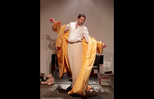Jacques de Bascher nous fait rire, nous surprend. Ce beau mec pleure d’être plongé trop tôt dans une fin de vie chopée un soir avec champagne, musique folle et obscure, sexe et cocaïne. Oui. Puis SIDA. Le tout début. Le fric et l’amour, son mec et son amant célèbres, et lui passant tout juste pour un très fier dandy, spécialiste de backrooms. À mi-chemin entre aristocratie défaite et prostitué top luxe. Il tente de nous expliquer, tout proche de nous − la salle est minuscule et tant mieux − ce qu’il a vécu, ce qu’il vit et espère vivre encore un rien. Il se change, nous montre que si, il est beau, que si il a du goût, que non il n’est pas terrifié. Ah ?
