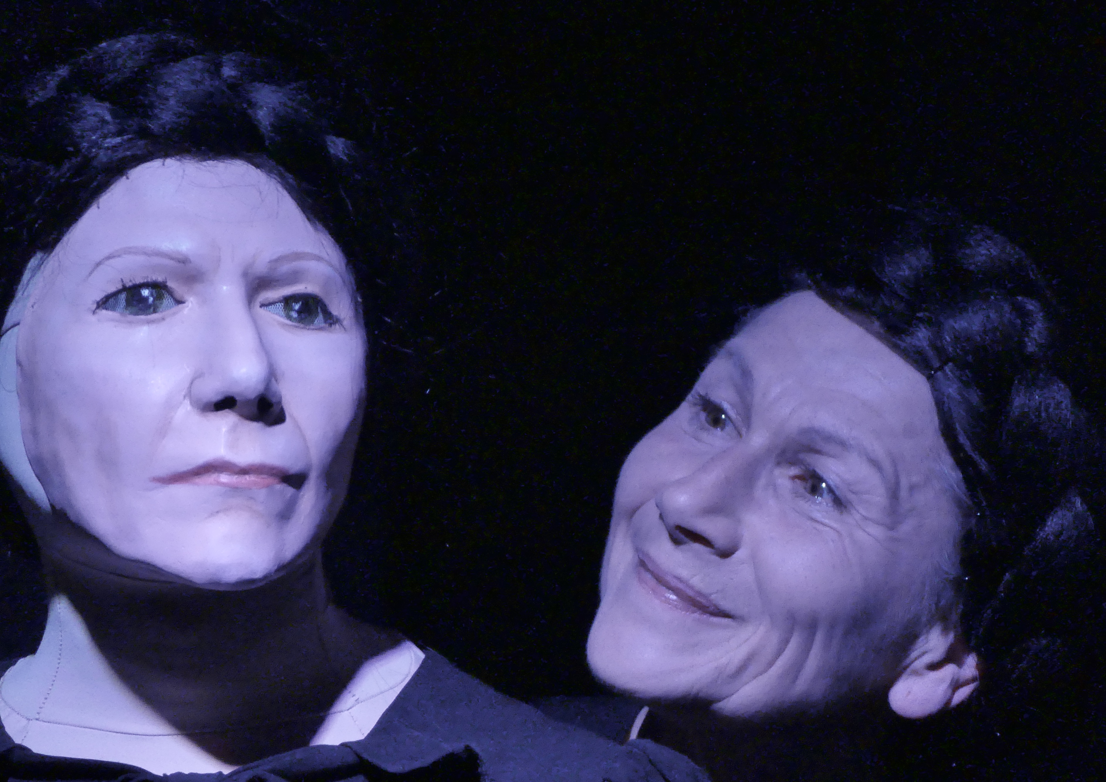 Madame Buisson, c’est Christine Koetzel, le corps et la voix engoncés de préjugés de classe, droite et raide en ses convictions affirmées. Celle qui parle, creuse le portrait d’Ida, se fait l’écho des autres voix qui l’approchèrent. Sans jamais l’atteindre. Ida, c’est Marion Vedrenne, marionnette vivante, muette et fantomatique, visage figé, qui insensiblement prend corps, devient par imprégnation troublante madame Buisson. Etrange métamorphose qui atteint à sa façon Christine Koetzel. « Je suis Ida ou je suis madame Buisson. », on y revient et c’est le fil rouge de cette mise en scène qui se refuse sciemment à répondre, restant sur la crête fragile de cette interrogation non résolue, à savoir qui parle ici. Ce monologue n’en est pas un, c’est un étrange dialogue que met en scène avec intelligence Laurent Michelin, où le silence assourdissant d’Ida fait réponse cinglante à madame Buisson. Mise en scène d’une grande finesse à vrai dire qui entre bravache dans les méandres d’une écriture qu’il est bon d’entendre à nouveau, porté brillement par deux actrices en immersion absolue dans cette adaptation d’un « Roman sans paysage / Roman à la première / Et à la dernière personne / Roman réduit à sa plus simple expression / Un personnage / Les autres diminués. ». Beau défi magistralement relevé. Et de cette « plus simple expression », Laurent Michelin a su tirer matière à une comédie humaine d’une cruauté non dénuée d’une ironie mordante, que n’aurait sans doute pas reniée Hélène Bessette.