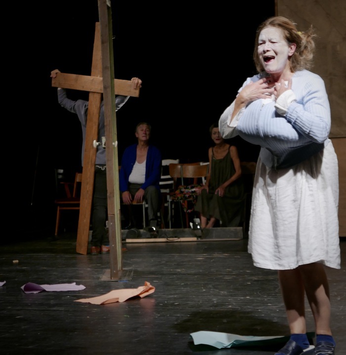 C’est à vue, sans illusion, que ce théâtre joue, dans la franchise de sa lumière, dans le silence ajouré par le carillon d’une horloge de salon, le grincement d’une porte et deux musiciens égrenant quelques notes concrètes. Dominique Collignon-Maurin instaure un régime et une exigence de vérité, de justesse qui passe outre au naturel (qui n’est que l’idéologie esthétique d’une époque qui voudrait se passer de l’art au bénéfice de la culture) pour atteindre à la profération, ultime gloire ceignant le nu de l’existence. Le grand jeu, immense, de Marie Vayssière, Emmanuèle Stochl, Patrick Condé, Jean-Marie Champagne, sert avec humilité et puissance, sans faillir, le grand soir. Et puis, sans prévenir, les corps décharnés de ces géants de la montagne au teint de plâtre, comme épuisés par le ballet des gestes nets et secs, le commerce des seins et des cuisses malaxés, s’en iront sans théâtre, gravant dans nos cœurs émus cette implacable et lucide épitaphe : « Je pars sans magie ».