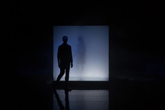 Le dispositif scénique capture les acteurs dans un espace temps irréel, et captive immédiatement l’attention des spectateurs. Au milieu du plateau, trône un énorme cube de verre que des rayons lumineux balaient de part en part. La lumière aveuglante blesse le regard du public, et découpe comme un laser, le corps des acteurs.