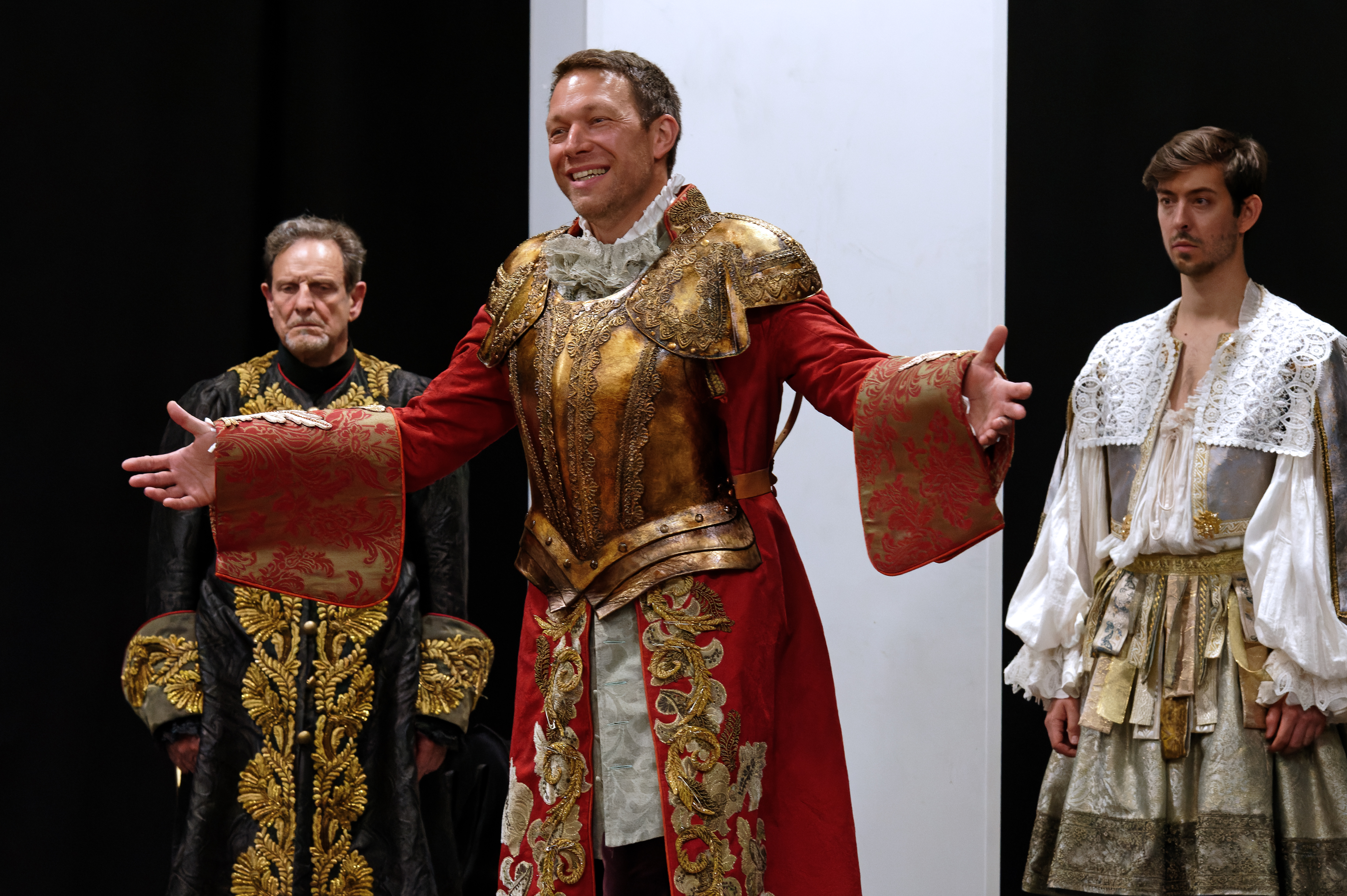 Ses acolytes ne sont, sans exception, toutefois pas en reste. Nadine Darmon incarne une Œnone sensible et dévouée, prévenante mais aussi compromise. Ulysse Robin campe un Hippolyte fragile et lui aussi dépassé par sa passion, mais dans une forme d’innocence et d’inexpérience que son visage juvénile et son débit empressé traduisent à merveille. Judith d’Aleazzo est une Panope avec ce qu’il faut de distance et d’ambiguïté. Le Théramène de Patrick Palmero, l’Ismène de Chani Sabaty et l’Aricie d’Eugénie Pouillot répondent aux profils plus normés de leurs rôles respectifs. Enfin, Julien Tiphaine excelle. Il avait déjà incarné le rôle de Thésée sous la direction de Schiaretti dans sa dernière mise en scène pour le TNP. Les vers sortent de sa bouche comme s’ils y étaient nés. Sa stature imposante, valorisée par son manteau de brocart, en fait un géant. Il exprime totalement, corporellement cette sensation qu’il revient du royaume des morts. Et sa pose figée dans la scène II de l’Acte IV est d’une telle puissance, jusque et surtout dans son visage de colosse outragé, où rien ne bouge, qui comble sa posture majestueuse que l’on ne se lasse pas de regarder quand on a la chance d’être dans son axe (par le hasard du placement de la salle circulaire d’Aubervilliers).
