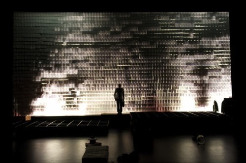 L’un des tours de force de Rossel est la réponse qu’il propose aux questions que pose l’adaptation d’une œuvre graphique sur un plateau. Du côté de la mise en scène, il met en avant l’artifice de la représentation, la dimension proprement théâtrale de l’action, ce que suggère la disposition du décor, rejeté au fond du plateau qui lui reste vide et nu. Ce décor fonctionne comme un rappel de la BD, mais en même temps, plus que cela. Comme plaqué en fond de scène, il évoque irrésistiblement la planéité de l’espace de la représentation graphique. Fonctionnant par grands pans quadrangulaires, disposés sur plusieurs plans, soit physiquement, soit par l’action de la lumière, il tient à la fois du système des planches propres à la BD mais aussi au cinéma (cette dimension cinématographique est aussi forte dans l’œuvre de Taniguchi que dans son adaptation) qu’à un univers pictural et un système perspectif propre à l’art japonais, dont on sait comme il a influencé notre propre rapport artistique à la représentation du réel. La mise en scène joue en permanence des possibilités qu’offre cette perspective en plans rabattus, matérialisation de l’étrangeté de la situation du personnage dont toute l’existence se redéploie simultanément sur un seul plan d’existence, à multiples niveaux. Ce jeu du décor et de la perception perturbe la construction perspective, en confondant les espaces, les verticales et les horizontales. La scène de la sieste sous les arbres est particulièrement frappante. Ce pourrait n’être qu’un effet de manche, un artifice spectaculaire rendu nécessaire par l’exigence de traduire absolument le manga sur scène, ce n’est pas le cas. Tout cela est fait avec beaucoup d’intelligence, avec un regard sûr et vif.