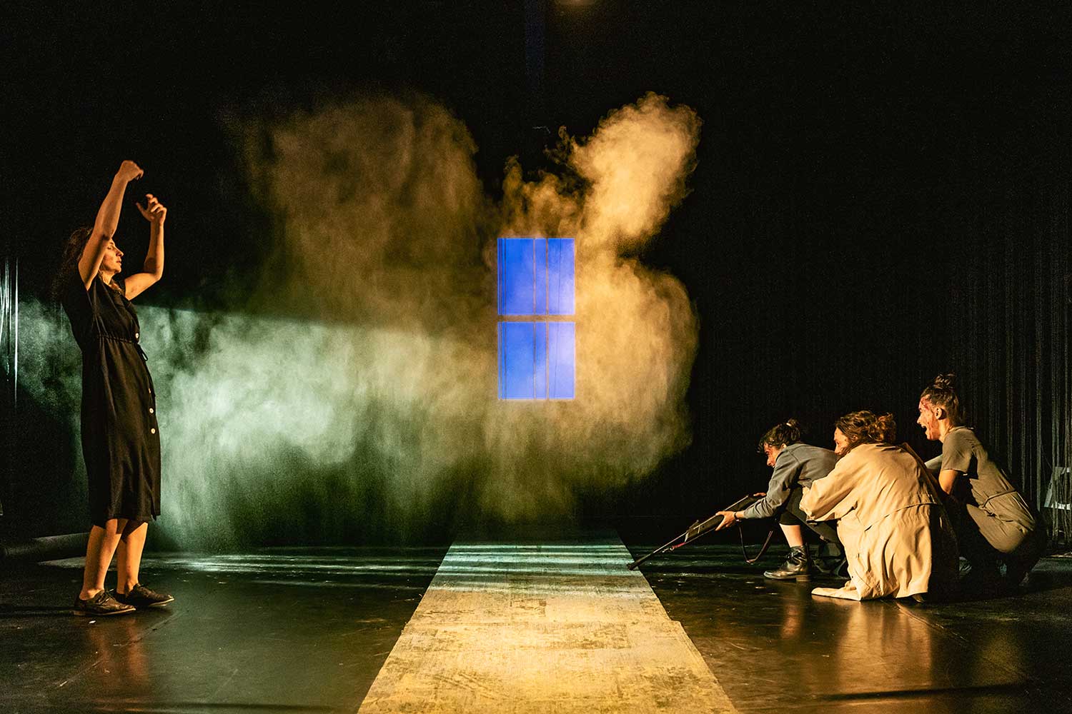 Dans cette fable aux personnages multiples, la particularité de cette adaptation orchestrée par Rémi Prin est de se concentrer sur le point de vue de ces quatre femmes dans un huis-clos intense, où la parole et les corps participent aussi bien à dévoiler les émotions à l’œuvre à l’intérieur de chacune, que soutenir le suspens des évènements extérieurs secouant le village.