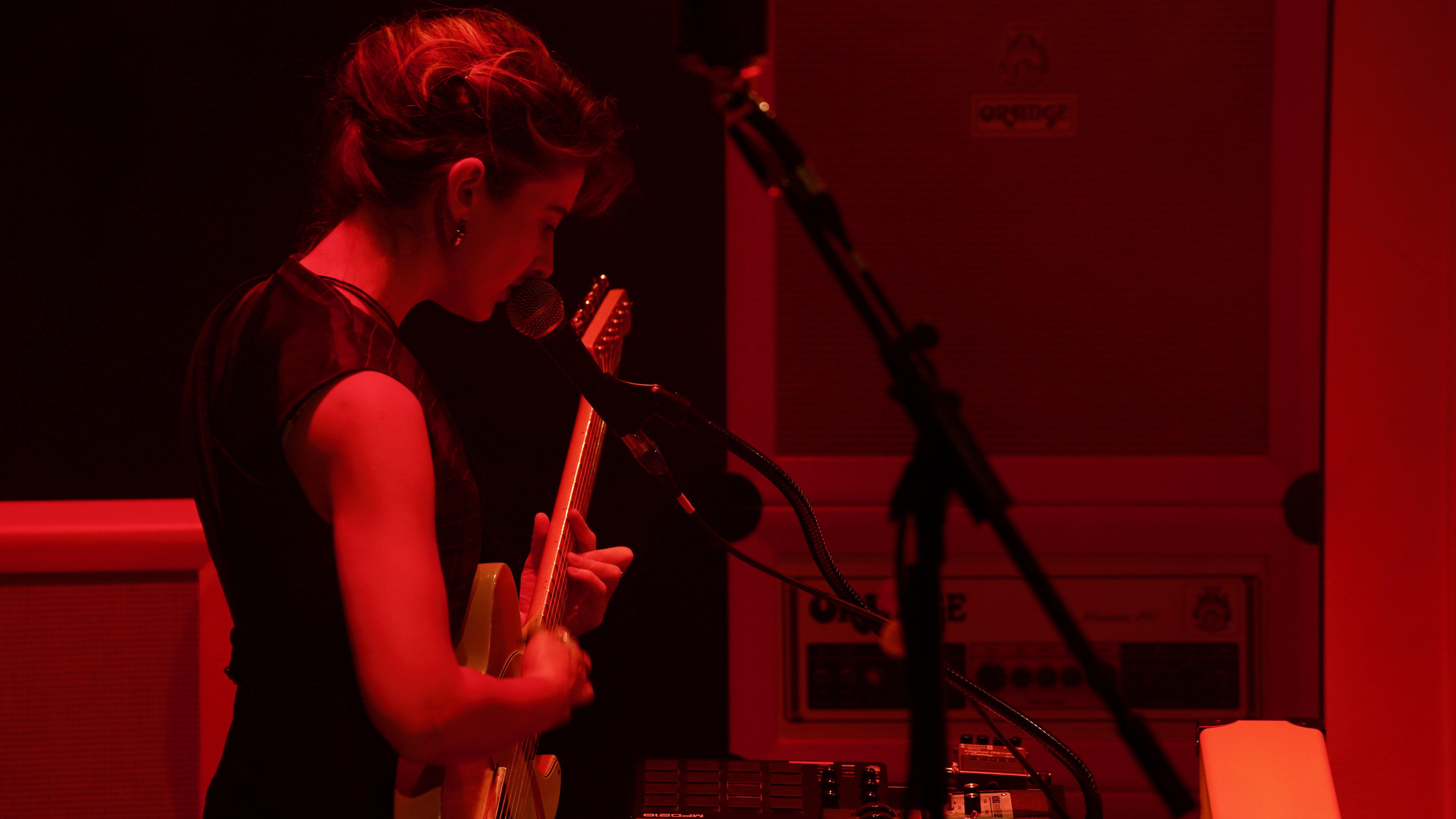 A jardin, un imposant système de baffles orange fluo, enclave d’où sera jouée la musique live du spectacle. A cour, ce qui s’apparente à une chambre, qui se révélera tour à tour chambre d’hôpital, d’adolescent, d’hôtel, etc.