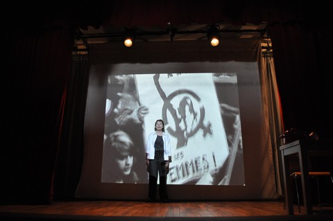 Elle est seule sur le petit plateau du Guichet Montparnasse, elle nous attend en fond de scène dans l’obscurité à côté de l’écran sur lequel sont projetés des paysages urbains à la façon des futuristes. Noir salle, lumière plateau, il fait chaud et la soufflerie empêche le silence. « Merci d’être là » Une adresse à une jeune femme, peut-être sa fille à qui elle va parler de la condition féminine en France, de la lutte des femmes, les connues et les moins connues qui nous permettent aujourd’hui d’être plus libres, pas encore tout à fait l’égale de l’homme. Récit entrecoupé de témoignage, d’archives.