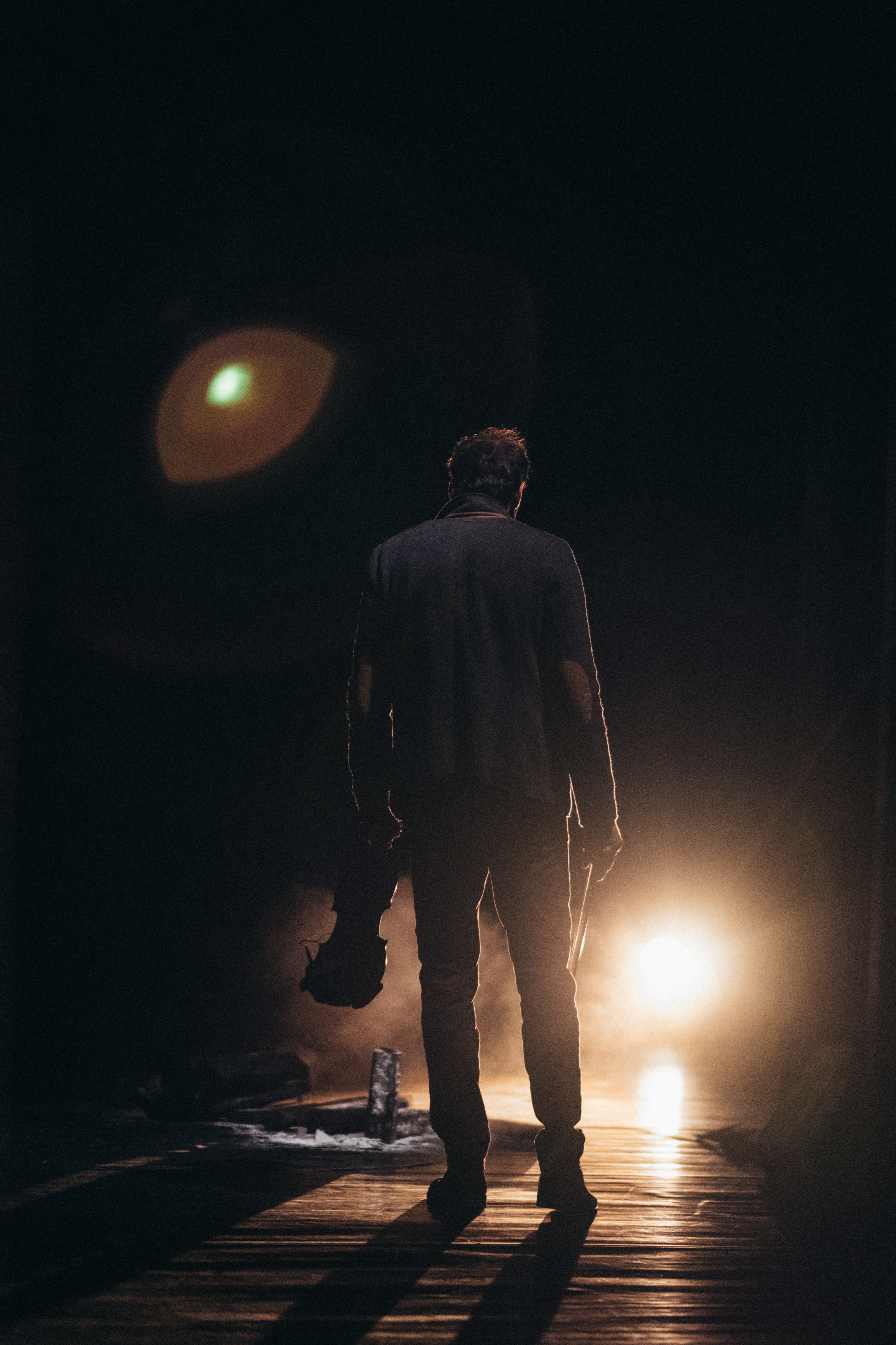 La lumière joue un grand rôle dans ce spectacle, sur le plateau noir elle révèle des espaces, une porte, un meuble, un tronc d’arbre déchiqueté, des ombres dans la nuit. Marien Tillet joue tous les rôles, alterne l’adresse au public et le récit d’une fiction horrifique. Sur la lande désolée un étrange sabbat se prépare, comme un rituel chamanique ; sans effets spéciaux, par la seule puissance de son verbe, une scénographie ciselée et son violon le comédien nous embarque pour une traversée d’anthologie.