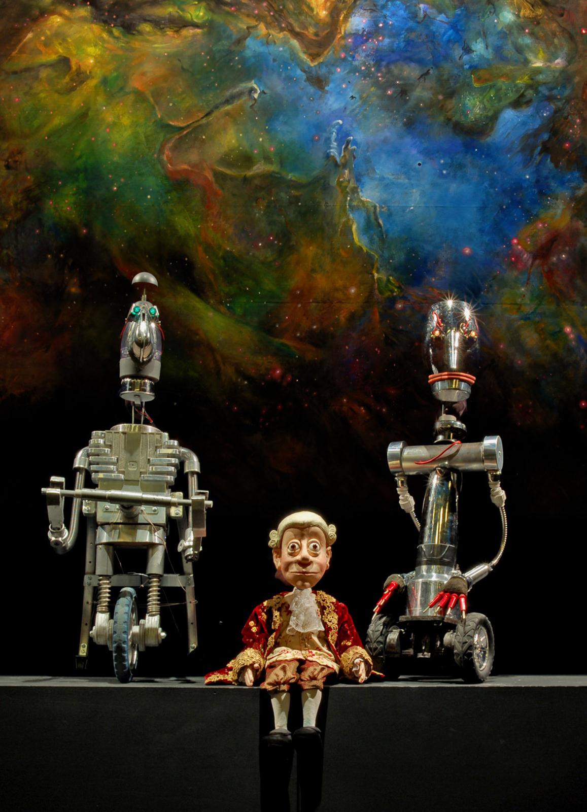 Ce spectacle est une création à proprement parler : Philippe Dorin ne reprend pas l’histoire de « 1984 », son texte est d’aujourd’hui. Il n’y a d’ailleurs pas « une » histoire : les scènes se suivent mais ne se ressemblent pas toujours. On part à la rencontre de personnages qui sortent parfois de nulle part, et on se laisse charmer par la curiosité. Des robots s’entretiennent dans une langue d’abrégés et d’initiales, trois personnages numérotés et d’aspect indifférencié (contrairement aux robots qui ont leur caractère !) font des apparitions régulières, un monstre à tête de diable s’entretient avec une sorte de lutin touffu, etc. Il faut s’ouvrir à un monde imaginaire, à la fois enfantin et ancré dans la réalité actuelle. Tous semblent chercher à éliminer la différence. Mozart lui-même se fera dépouiller de son propre talent, et de son nom, pour devenir Momo. Les robots martyrisent le plus faible, les numéros 3 et 5 forcent le numéro 11 à se suicider encore et encore parce qu’il veut être seul ou parce qu’il se sent manipulé. Il y a d’ailleurs un jeu entre la manipulateur et le manipulé, l’un des marionnettiste se fera même licencier par sa propre marionnette, et se verra remplacé par une puce appelée « le Manipulator ». Mais qui est Big Brother ?