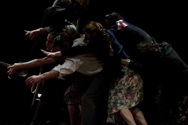 La pièce est construite autour d’une suite de tableaux. Tour à tour musicienne, plasticienne, circassienne, la troupe sait varier les atmosphères, et laisser les émotions reposer quand il le faut. A l’hystérie d’un prêtre délirant succèdent ainsi quelques notes apaisantes d’un violoncelle… avant que la pièce ne bascule à nouveau lorsque le musicien se fait ridiculiser. Tour à tour sombre, poétique ou délirante, la pièce pourrait ployer sous une telle profusion, et devenir brouillonne et insaisissable. Pourtant il se dégage une belle cohérence de ce grand jour. Chaque épisode se concentre sur une émotion précise, une idée forte. L’image de cette jeune mariée qui court après son amant remonté comme un pantin mécanique reste longtemps dans les esprits.