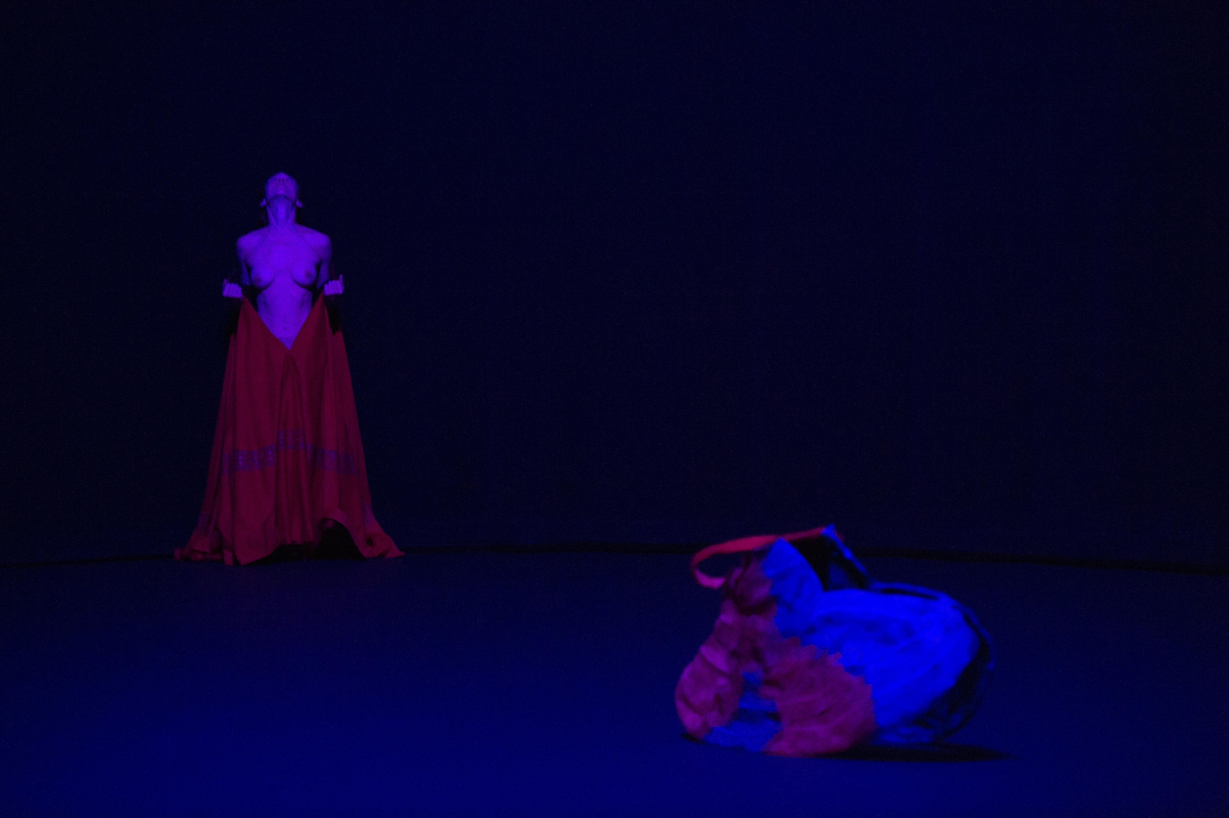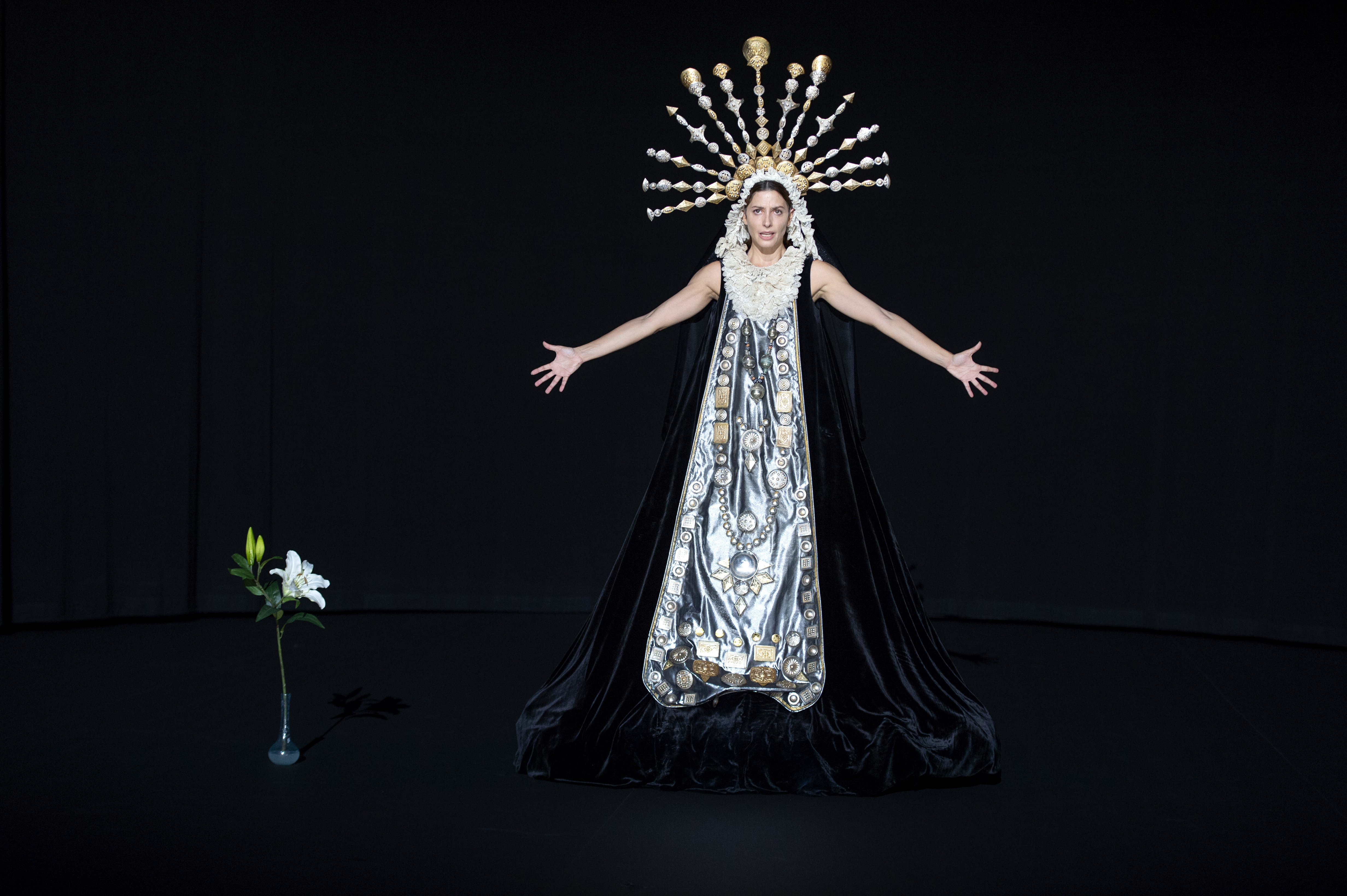La vierge espagnole avec sa coiffe-couronne lumineuse et imposante brille de tous ses feux. Rayonnante dans sa posture, sa diction, son discours volontariste, sa « verticalité ». C’est la femme qui monte, qui jamais ne courbe l’échine, elle pense que la vie ne se donne pas, qu’il faut coûte que coûte marcher, avancer, quitte à ramper car « l’entrée dans le monde » est comme une « entrée dans la violence ». C’est une femme qui semble avoir dû vaincre l’abus (sexuel dans l’enfance ?) mais qui n’est pas (plus ?) soumise et pardonne (sans doute) les mains offertes, bras en croix après avoir prononcé ses annonciations, tels les oracles d’une Cassandre illuminée, et se dénude en évoquant la sororité, traînant sa robe dans l’obscurité qui se reforme pour la laisser quitter ce monde.