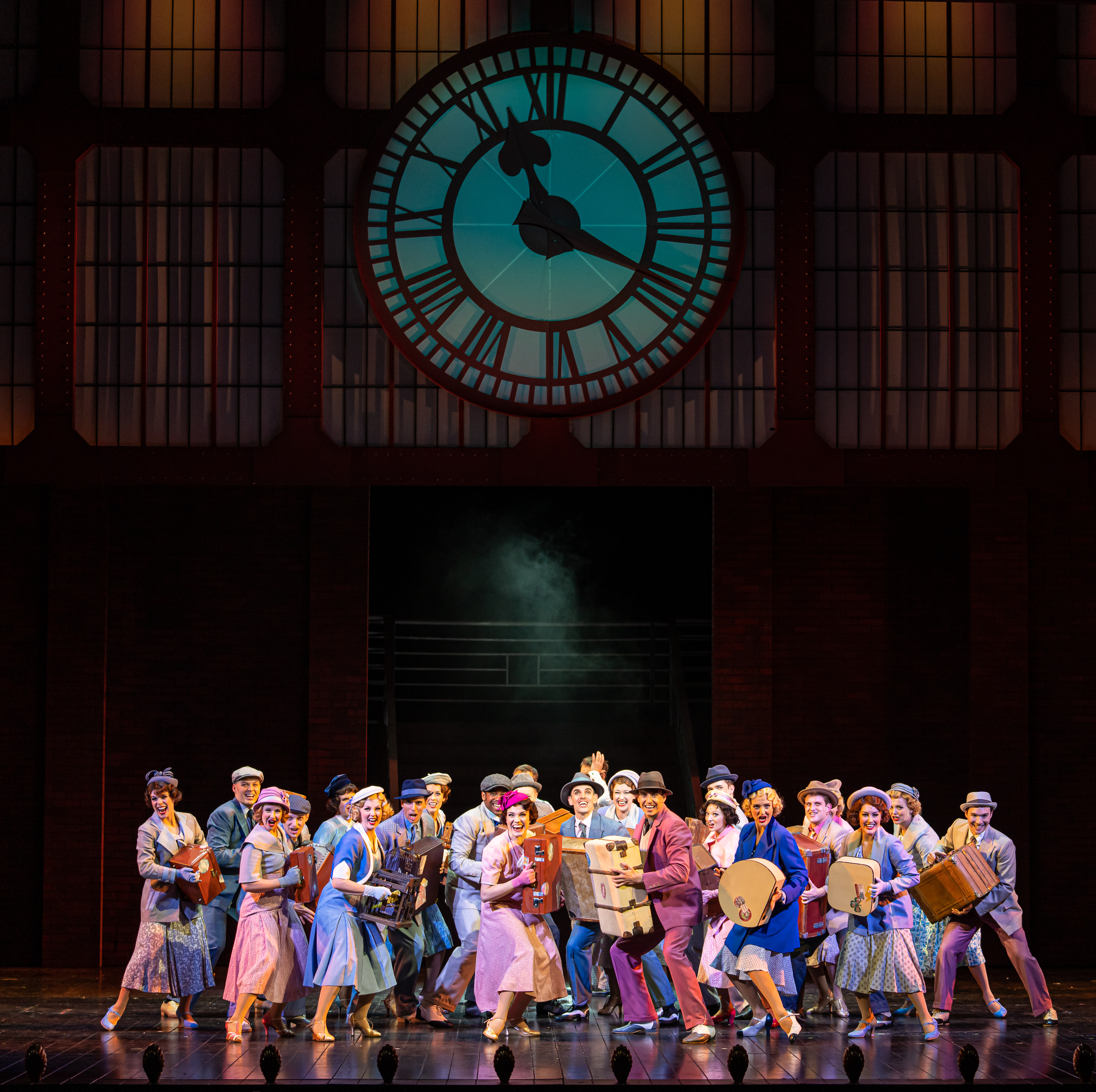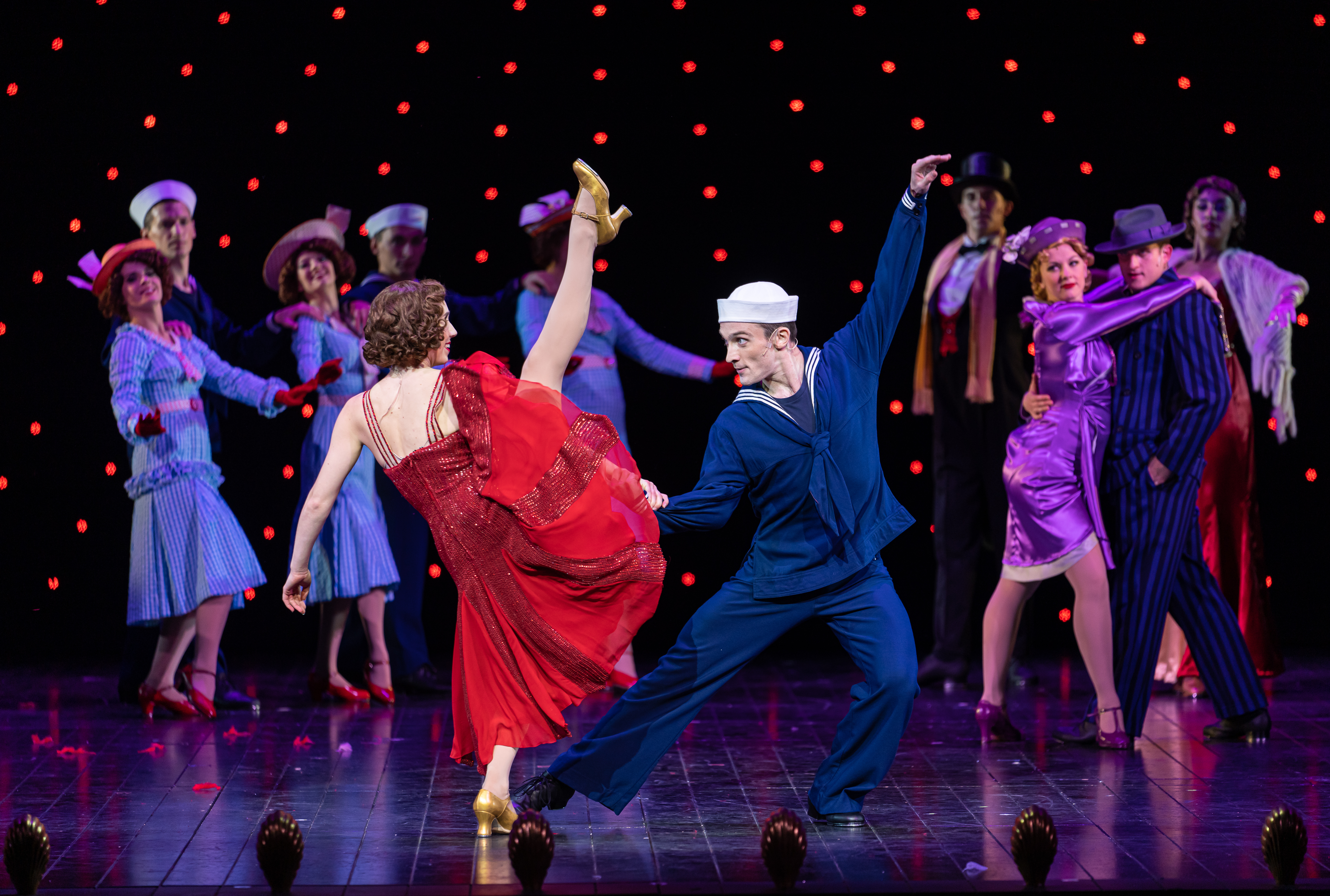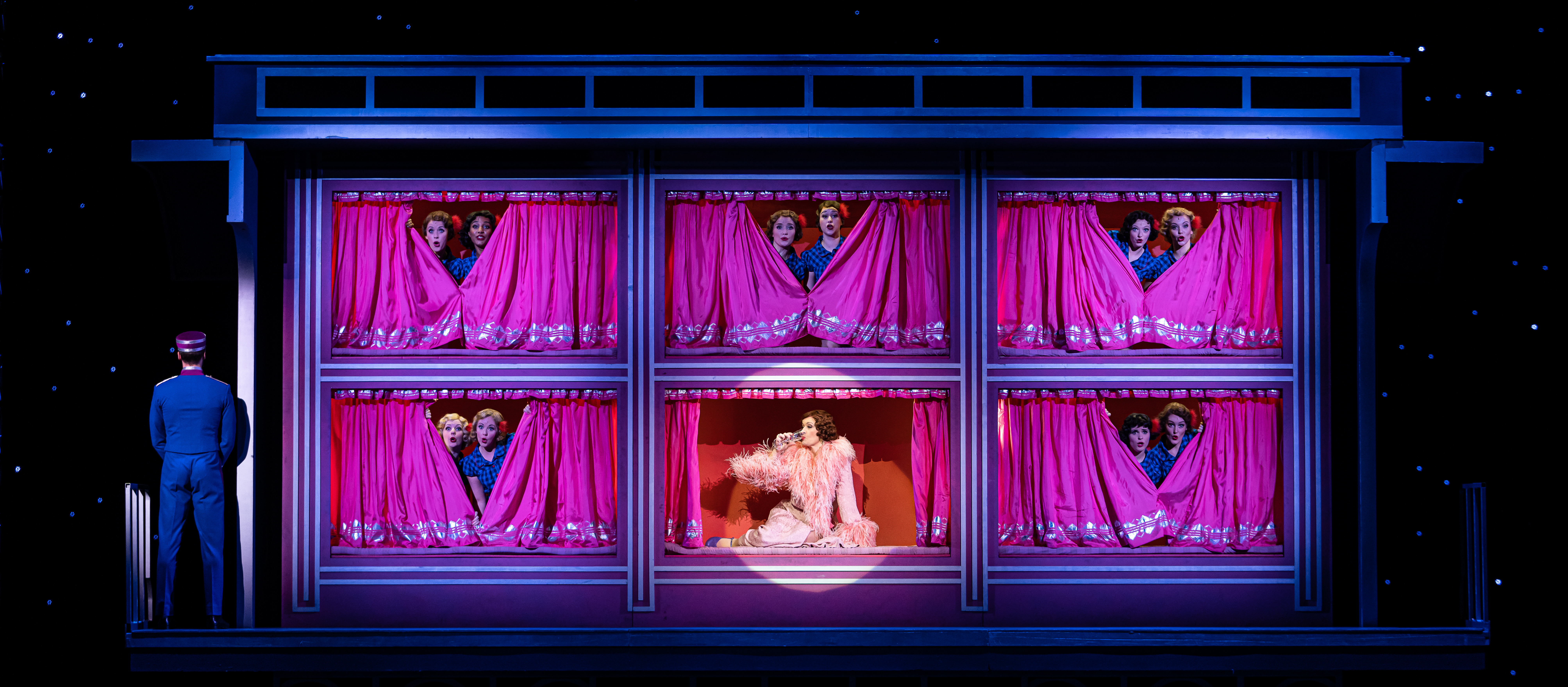La première scène de claquettes est incontestablement la meilleure. Après les quelques minutes d’introduction musicale (orchestre dirigé avec énergie par Gareth Valentine) rideau fermé, ce dernier se soulève partiellement ne laissant à la vue du public que la partie inférieure des danseurs exécutant un premier numéro de claquettes captivant. Les numéros s’enchaînent avec efficacité et précision, les beaux (dans l’ensemble) décors évoluent sans cesse à une vitesse confondante, la troupe changeant de costumes (parfois poussant le kitsch un peu loin) à chaque scène, laissant des images léchées : les claquettes de la jeune héroïne sur le piano blanc, les cabines couchettes aux rideaux roses ; les immeubles new-yorkais agencés de manière kaléidoscopique… Mais la scène qui mérite d’être autant saluée que celle d’ouverture, bien que n’étant pas un passage dansé, est jouée juste après l’entracte : les comédiens, sur les trois étages de la structure métallique, sont dans leurs loges, dont les miroirs entourés d’ampoules s’allument alternativement pour la chanson « Every situation has a sunny side ». C’est beau, joyeux, et impeccablement chanté et donne envie d’y croire…