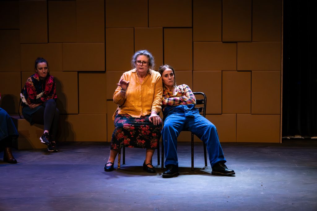 A partir de ce simple pitch s’inspirant de la dure réalité que le monde ouvrier a connu ces dernières années, notamment l’usine Lejaby en 2012 qui a particulièrement servi d’inspiration à Stefano Massini, l’auteur italien a écrit avec 7 minutes (comité d’usine) une pièce de théâtre haletante, qui a fait l’objet d’une adaptation cinématographique en 2017, mais n’avait été jouée qu’une seule fois en France (en l’occurrence dans la mise en scène bi-frontale de Maëlle Poésy au Vieux-Colombier en 2021), avant que la compagnie du Berger, en résidence au centre culturel Jacques Tati d’Amiens depuis de nombreuses années, s’en ressaisisse. La mise en scène dynamique d’Olivier Mellor, servie par des interprètes gouailleuses et frondeuses à souhait, est rythmée par de la musique live, jouée par des musiciens dissimulés derrière un mur de cartons figurant la séparation de l’espace clos du comité d’usine et réservant une jolie idée scénographique finale. Si les moments choisis par ces interventions musicales ne relèvent de l’évidence tout de suite, il nous semble que le metteur en scène a peut-être voulu personnifier par ces hommes qui resteront invisibles la présence des « costards-cravates » attendant, tapis dans leur salle de réunion restant hors champ, le verdict qu’ils ont eux-mêmes provoqué et occupant partiellement et inopinément l’espace sonore de discussion des femmes, marquant ainsi à la fois une désynchronisation des espaces et une pression du pouvoir capitaliste et masculin omniprésente.
