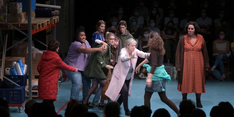 Pour ncarner ces personnages aux prises avec « le concret » et « l’idée », les onze comédiennes sont littéralement prises en étau dans un dispositif bifrontal. La mise en scène de Maëlle Poésy ressemble à un jeu d’échecs où chacune avance ses pions sans stratégie malveillante mais en tentant d’écouter ses instincts et ses convictions. Magnifique chœur de femmes où les tirades puissantes succèdent à des réflexions lancées comme des boulets de canon, Sept Minutes nous entraîne dans un rythme éffrené, celui du temps qui s’écoule avant de donner « la » décision aux patrons. Une partition où les silences valent autant que les mots, où les corps s’engagent, s’affolent, s’épuisent et se recroquevillent pour mieux s’insurger ensuite. Chacune de ses ouvrières déploît son discours, parfois maladroitement, mais toujours sincèrement, et elles se dévoilent intimement sans jamais oublier qu’elles représentent un collectif plus grand qu’elles. Une performance poignante et un texte qui nous habitera encore longtemps…