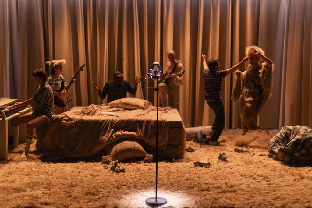 Ce spectacle est à bien des endroits amusant, joyeux, on ressent le plaisir que peut prendre cette troupe devant nous à chanter, danser, imitant cette fascination adolescente et souhaitant nous présenter les difficultés que peuvent être les premiers pas vers l’adolescence. Une chambre d’ado occupe l’espace principal de la scène, avec un lit magique sur lequel Sylvain reste vautré et du matelas duquel s’échapperons ici où là copains, copines, musiciens, chanteurs, foule en délire, orchestre, danseurs et danseuses, Sylvain en attente de l’arrivée de la grande, unique, sublime Mylène Farmer. À mots doux souhaiterait nous présenter les affres du passage à l’adolescence, sa complexité, sa poésie, sa douceur. Mais le spectacle qui en ressort n’est que fort sympathique. Ce gamin s’enlise dans l’enfance et tente d’atteindre un nouvel âge, oui. On voit une belle équipe de six comédiens et comédiennes virevolter, chanter (très bien), aller et venir… et tout recommencer. Les idées diverses et variées ne se bousculent pas pour À mots doux. Rien ne sort vraiment de cette chambre, même si toute l’équipe s’évade de dessous le lit pour chanter et danser. On pourrait deviner des aventures folles dans la tête de ce gamin, mais elles n’apparaissent pas beaucoup et peu nombreuses, ligotées rapidement dans une répétition rythmée. On peut attendre une présentation plus complexe de cet adorable gamin, mais deux ou trois symboles tournicotent et gesticulent, sont repris, persuadés que le lit magique, avec Farmer en fond sonore et duquel personnages multiples entrent et sortent sera déjà extraordinaire et nous laissera KO. Ce n’est pas le cas. L’équipe est sympathique et musicienne, et forcément pourvue de micros, sinon que serait le théâtre aujourd’hui ?