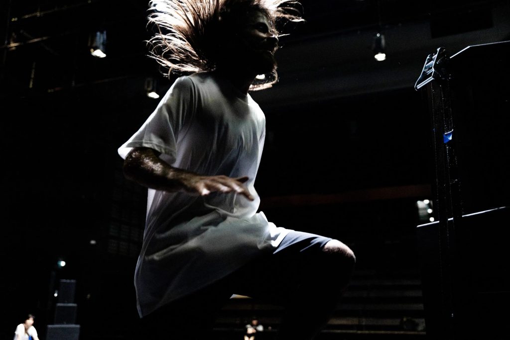 De la danse à la transe il n’y a que deux lettres d’écart. Ce qui les différencie réside dans leur entame, ce qui les rassemble brille dans leur final. La transe comme dépassement de la danse en quelque sorte. Ou encore : la transe comme continuation de la danse par d’autres moyens, ceux de l’esprit. Ametonyo Silva es notre sorcier chaman. Tee-shirt blanc, short, basket, cheveux mi-longs en bataille, il nous accueille déjà bondissant. L’entrée du public est celle du garage de la Ménagerie de verre, les décibels et le fumigène de discothèque nous mettent directement dans l’ambiance d’une fin de soirée avec sa longue queue qui s’allonge sur le trottoir. La proposition d’Ametonyo Silva, qu’il présente avec humilité comme une recherche chorégraphique, nous situe dans un autre rapport spectaculaire. Est-ce d’ailleurs encore un spectacle ? ne serait-ce pas plutôt une expérimentation, un processus, une métamorphose de l’acte spectaculaire proprement dit ? ne serait-ce pas également une invitation à détourner notre regard vorace de spectateur-consommateur pour entrer dans une relation inédite, sensible, sensorielle, ouvrant le champ de la réception à l’entièreté physique et invisible de notre environnement ?