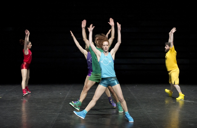 Aidés de huit danseurs colorés de la tête aux pieds, « Aerobics ! » est d’abord une pièce réjouissante. La chorégraphe n’a pas hésité à se saisir de tout le kitsch de ce sport, pour nous (re)plonger dans l’univers des années 1980. Lycra, mouvements collectifs, et poses improbables provoquent d’emblée quelques sourires. C’est toutefois bien son esthétique qui a intéressé la chorégraphe allemande. Paula Rosolen En compose ainsi une suite de 3 tableaux assez proches où plusieurs séquences de danses très géométriques se succèdent.