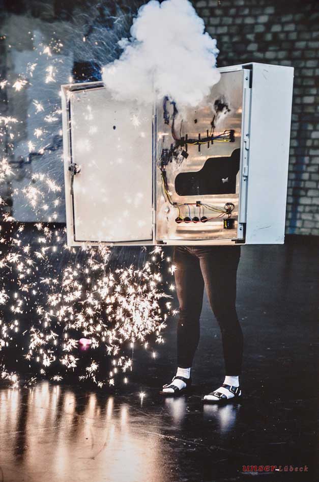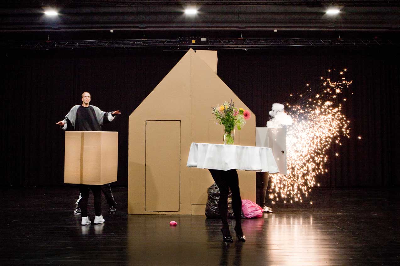 A-t-on jamais vu un transfo électrique dépité péter un plomb ? Cracher ses dernières flammes et mourir dignement ? Bienvenu dans le monde de Miet Warlop, plasticienne et metteuse en scène belge. Belge, cela a évidemment son importance. Univers poético-azimuté, surréaliste où les objets les plus quotidiens ont une âme sur pattes, des sentiments souvent contrariés, un penchant pour la catastrophe et un sens de la tragédie certain. Sur un plateau éclairé sans apprêt, au centre duquel trône une maison de carton, de celle des comptines d’enfance qui recèlent bien des mystères, se noue d’étranges relations, guerres intestines et tentative de conciliation entre objets récalcitrants, merveille de récup recyclée, et humain atrabilaire. Ce dernier n’ayant, au sens propre du terme, pas d’autre réponse que de trancher dans le vif. Dialogues de sourd, fait de mutisme têtu ou de quelques grommelots et borborygmes impératifs pour tout langage. Entre esthétique cheap et bricolage, Miet Warlop a l’imagination féconde et déjantée, et fait souffler dans cette reprise un vent de folie, entre inspiration cartoonesque et burlesque, mais aussi de gravité bien planquée derrière la loufoquerie des situations. C’est de notre rapport aux objets dont il est question ici aussi. Qu’une simple boîte en carton munie d’un appendice (merveille de trouvaille que ce « personnage » poétique) puisse en remontrer de façon ferme et définitive aux hommes, augure mal d’un avenir consumériste outrancier et individualiste. « Objets inanimés, avez-vous donc une âme / qui s’attache à notre âme et la force d’aimer », c’est d’avoir oublié sans doute la seconde partie de cette assertion de Lamartine qui provoque ici la tragédie. Et bientôt la nôtre affirme Miet Warlop dans un final apocalyptique irrésistible où les entrailles de la maison, on peut dire ça, finissent par déborder, envahir le plateau et la salle.