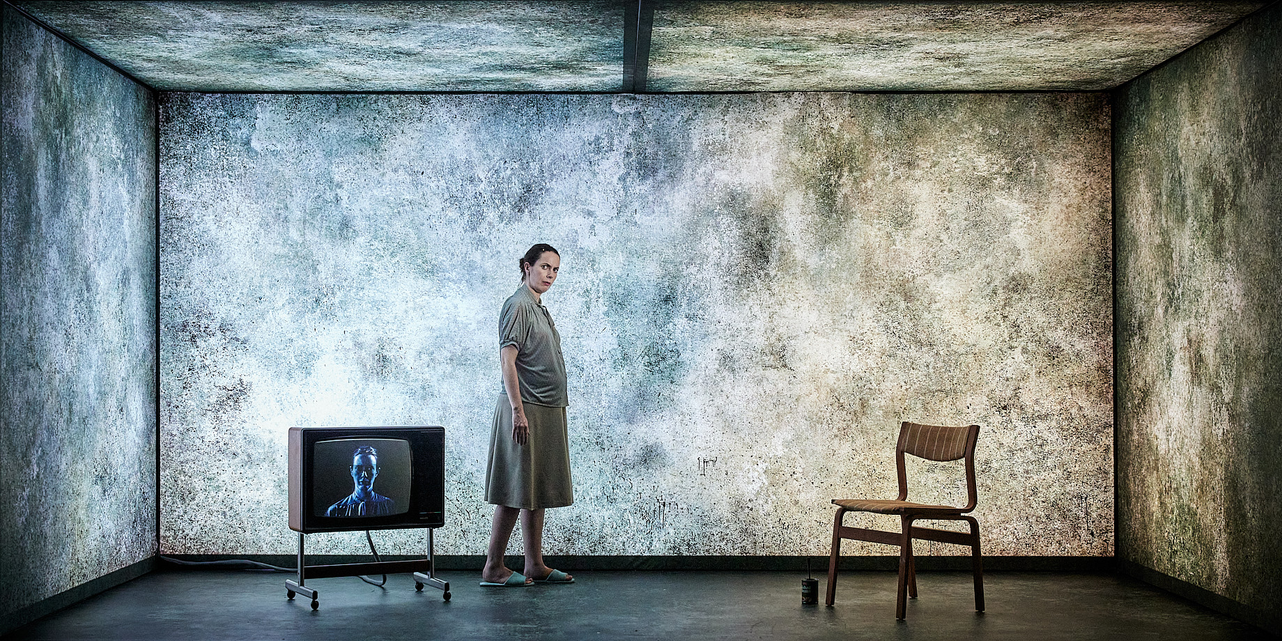 Le décor s’allège dans la seconde pièce où ne reste du premier que la dimension de la pièce et son fond tacheté, ainsi qu’une chaise et un téléviseur affichant une image fixe consistant en un logo comme au temps des rares chaînes de télévision avant que les programmes ne commencent. C’est le revêtement des murs du plateau qui va susciter rapidement l’attention de la comédienne, puisqu’il s’agit d’abord d’une variation sur une tache imaginaire qui va prendre toute la place du récit dans un premier temps puis conduire (on ne sait trop comment) au dédoublement, triplement, quadruplement de la personnalité de la femme, se traduisant par la projection de son autre moi dans l’écran de télévision et dans le récit et par une multiplication de voix off se superposant qui obligent à renoncer à une partie du dialogue, ce qui est évidemment délibéré et astucieux et de fait déstabilisant.