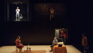 La scénographie sur deux niveaux sert parfaitement l’entrelacement des deux narrations et parfait l’ambiance chaotique. À l’instar d’un ring, les comédiens « hors jeu » s’assoient et regardent les scènes se jouer sur le pourtour du plateau. La présence de la vidéo, loin d’être gratuite, plonge le public dans la réalité choc des images. Le jeu, le faire semblant du théâtre se cogne à la réalité sanglante comme une piqure de rappel. Comme pour Taim dans le coma, un personnage éclaire les spectateurs, nous laissant le temps nécessaire pour se demander si nous aussi, sommes dans le coma…