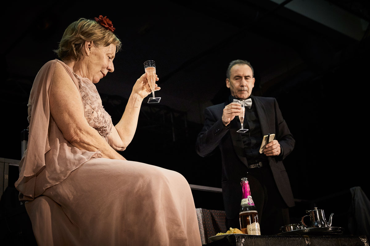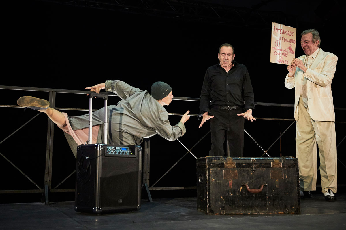 L’alternance entre ces deux œuvres et entre ces deux ambiances rend pourtant moins fort l’ensemble. Si l’on n’est pas familier avec l’un ou l’autre des deux univers, il est difficile de rentrer dans chacune des histoires, de profiter de façon égale de tous les personnages. C’est un moment de scène très particulier, un hommage à des créateurs et des écritures, mais le montage a ses limites. Par exemple, lorsque chaque scène de l’œuvre d’Eduardo de Filippo commence, elle est indiquée par un petit écriteau apporté par l’un des comédiens. Les ruptures de ceux-ci, leur énergie, vaut bien plus que ces cartons pour nous signifier que l’on a changé d’endroit et de protagonistes. Et puis, on n’a parfois pas forcément envie de quitter l’une des scènes ou le périple d’Eduardo pour passer à autre chose. Certains passages sont si drôles ou étranges, qu’on ne comprend pas le besoin du montage.