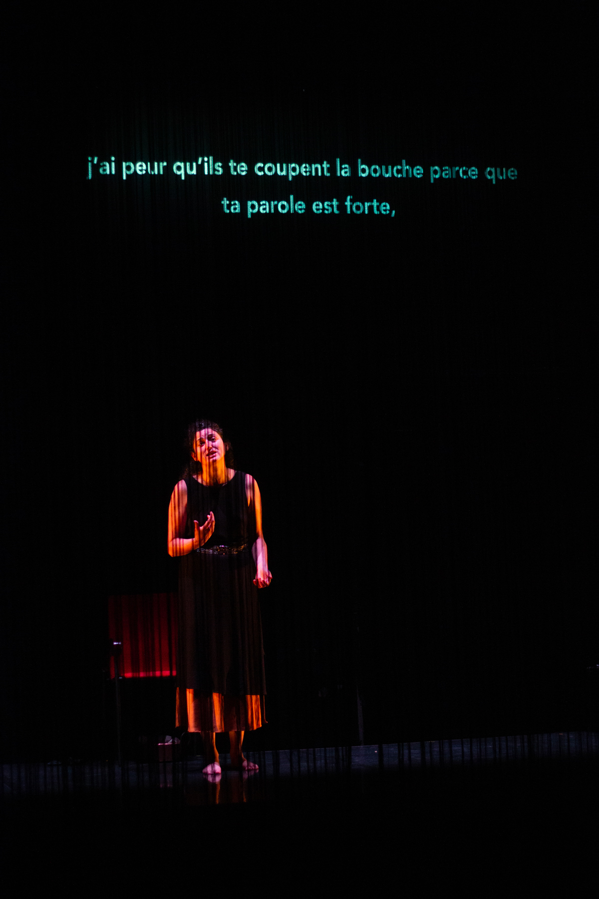 Amnesia est pour le moins surprenant. Ce spectacle nous entraîne dans les méandres d’un pouvoir, suprême et négatif évidemment, où l’on impose, enferme, tue. Devant nous un immense espace sombre, dissimulant ou révélant le roi, un général, un militant politique, leur entourage et le peuple, sa voix. Scénographie très réussie, apparition, disparition, lumière ou obscurité quasi terrifiantes dans lesquelles ces personnages vont, en français et en arabe, se jeter au visage leur violence incontournable, tenter de se défendre, de défendre le peuple, montrer combien la liberté, l’union positive devraient être ses bases incontournables. Le tout dans un univers sombre, mêlant le visible et l’invisible, le flou, l’incontournable, l’inimaginable.