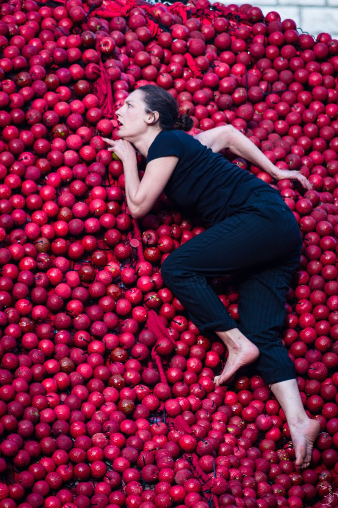 Du haut d’une immense structure représentant un tas de pommes elle questionne la vie, sa vacuité, mais aussi son sens et recherche ce qui reste de l’enfant que nous étions. Elle escalade, s’attache, se retient, tombe et se relève et il est impossible de regarder ailleurs. Elle tient notre regard, notre attention. De ce tas de pommes dont elle en croque quelques-unes, elle fait naître, extrait des objets qui deviennent entre ses mains immédiatement des idées, des symboles. Elle convoque Blanche Neige, Lewis Caroll et la pomme et le serpent du paradis et nous suivons émerveillés sa quête.