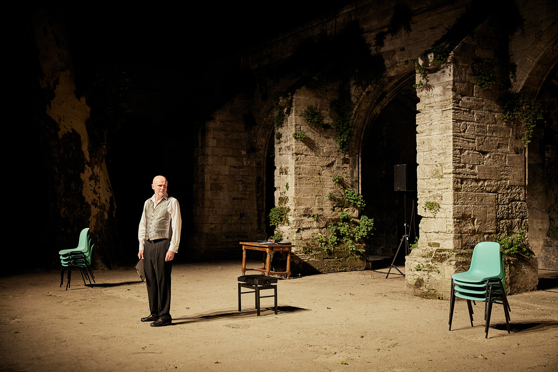 Dès son entrée, il met en place une forme de connivence avec son public. Bonhomme, ou plutôt hâbleur, il explique le déroulement du spectacle, fait venir son invité (en l’occurrence la comédienne et metteuse en scène Natacha Koutchoumov le 6 juillet) du soir, équipé d’un micro et d’oreillettes, lui donne le script lui précisant et nous précisant par la même occasion son dispositif théâtral. Tout est écrit, le comédien invité doit lire le texte ou répéter celui passant par l’oreillette. Tim Crouch est l’hypnotiseur. L’invité joue un père de 46 ans d’un mètre 90, mal rasé, qui a perdu sa fille dans un accident de voiture dont est responsable son interlocuteur. A partir de ce moment-là, de cette phrase là (« J’ai tué ta fille »), le malaise s’installe vraiment. Des chaises sont installées avec des invités fantômes, le public désigné comme celui enivré d’un pub anglais, le lieu magique et les arbres majestueux du cloître ne sont pas utilisés…