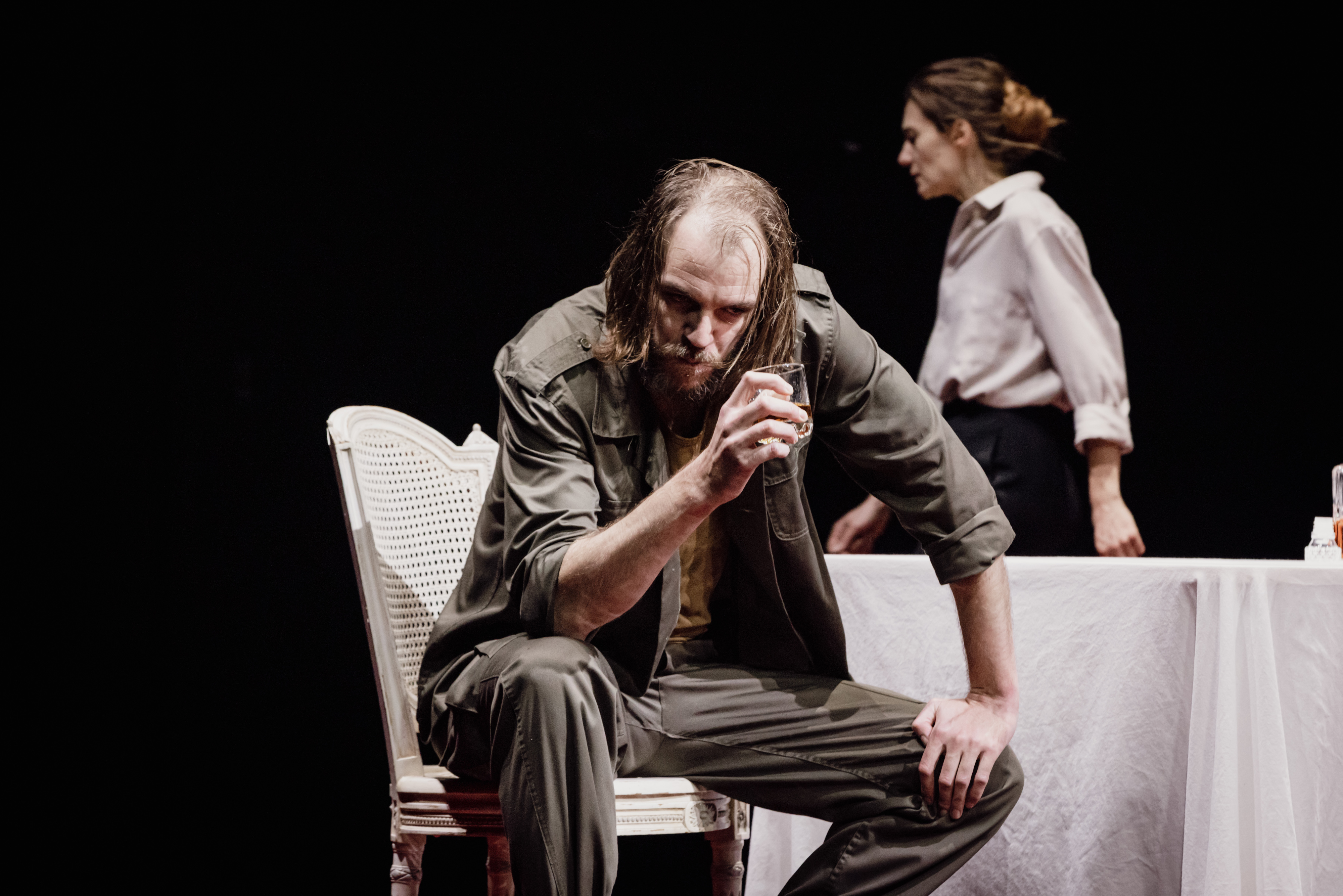 Ces exacerbation et tensions sont bien sensibles dans la mise en scène minimaliste de Stéphane Braunschweig qui avec cette création d’Andromaque signe sa troisième confrontation à Racine (après Britannicus en 2016 et Iphigénie en 2020). Les comédiens évoluent dans des vêtements contemporains sur un plateau habité par quelques chaises et une table comme seuls éléments immaculés du décor. L’essentiel de la dramaturgie repose sur une scénographie centrée sur une flaque (peu visible pour le public de l’orchestre), qui va se transformer en marre de sang. Les uns et les autres transitent par cet élément humide qui vient mouiller leurs vêtements comme leurs vies respectives, puis les souillent, ainsi que l’ultime carnage l’impose. Le Destin est implacable.