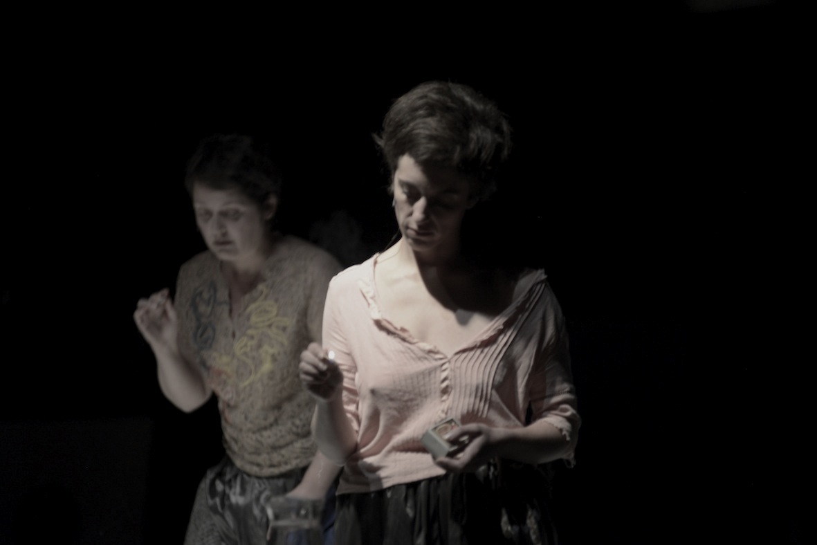 Sophie Pernette et Juliette de Massy, cheveux courts, longues jupes, semblent être assises, recluses, de tout temps. Dans une sorte d’anachronisme où le passé d’Annette se conjugue avec le temps présent des deux interprètes, leur sororité convoque l’ancien asile de femmes tout en diffractant le poème d’Annette dans ce chant qui rompt le fil du temps.