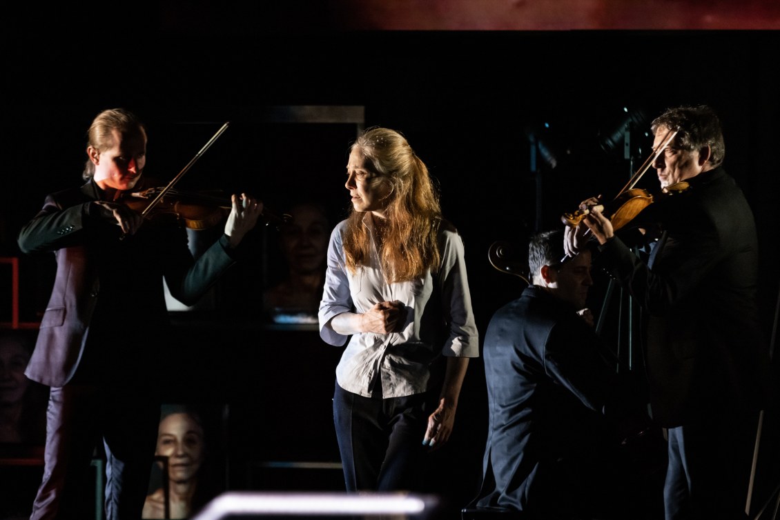 Dans le savant équilibre des images vidéo, de la musique, et du texte porté par les actrices, Guy Cassiers entrelace les formes et crée un dispositif capable de développer la réception du spectateur au-delà de la simple compréhension. Ainsi de la musique de Chostakovitch, interprétée sur scène par les musiciens du Quatuor Debussy, qui jamais ne tombe dans l’illustration ou le sentimentalisme. Non, cette musique s’immisce sensiblement et se retire avec la même organicité que si elle dialoguait avec l’espace et le temps scéniques. Pour Antigone à Molenbeek, elle se déploie telle une puissante caresse consolatrice.