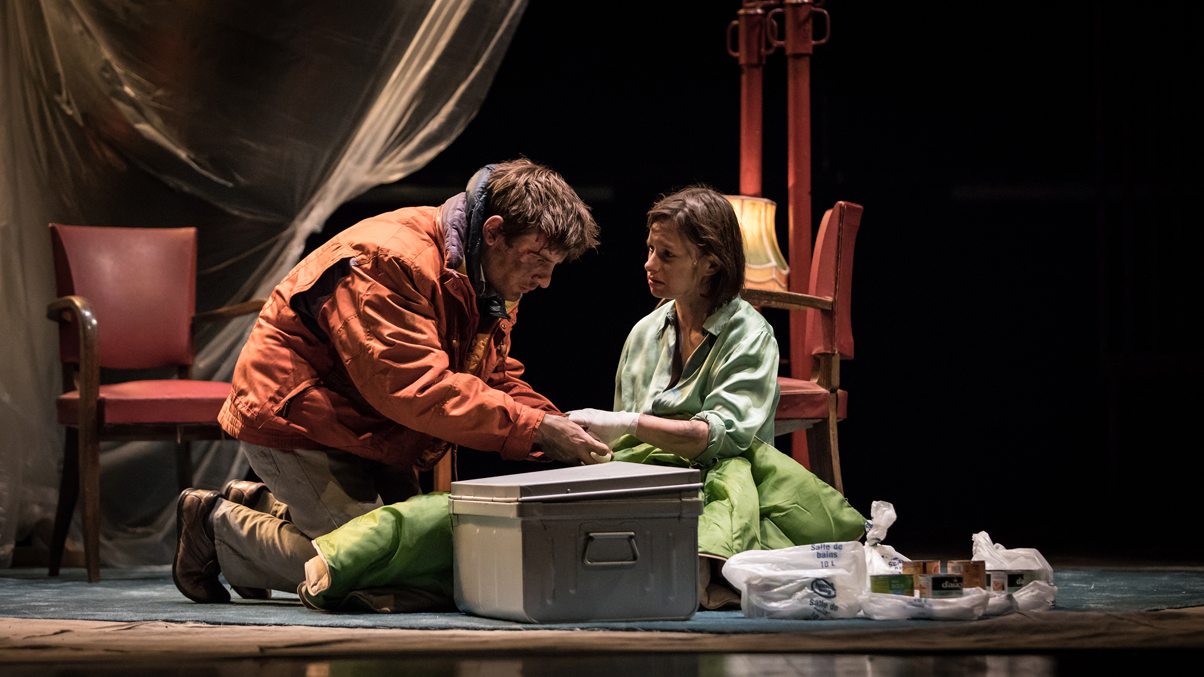 Louise se réveille dans l’abri anti-atomique de l’appartement de Mark où ce dernier l’a emmenée alors qu’elle était inconsciente. Il lui décrit à son réveil la situation chaotique au dehors, les corps qui essayent de se relever et dont des morceaux se détachent, le nuage, les destructions. Ils semblent les seuls survivants d’une explosion nucléaire. Il dit s’être d’abord enfui, puis être revenu la chercher. C’est la première scène d’une pièce d’une heure trente, qui en compte une quinzaine, toutes séparées par un noir/musique sur le plateau.