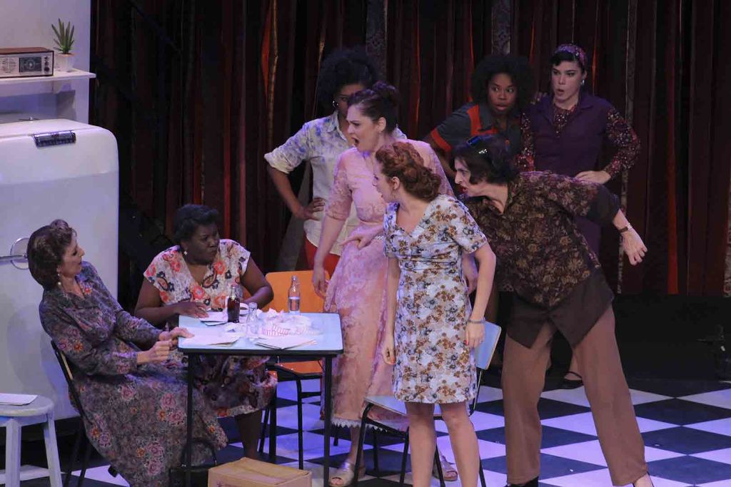 As comadres, d’après Les belles-sœurs de Michel Tremblay, dans sa version musicale de 2010, pièce chorale pour 20 actrices-chanteuses, adaptée ici en portugais pour des actrices brésiliennes, et dont la mise en scène de René Richard Cyr est ici « supervisée » par Arianne Mnouchkine. Formidable pièce, terrible et profondément juste par son propos, la condition féminine, où pourtant l’on rit énormément entre deux claques brutales et bien senties, nécessaires.