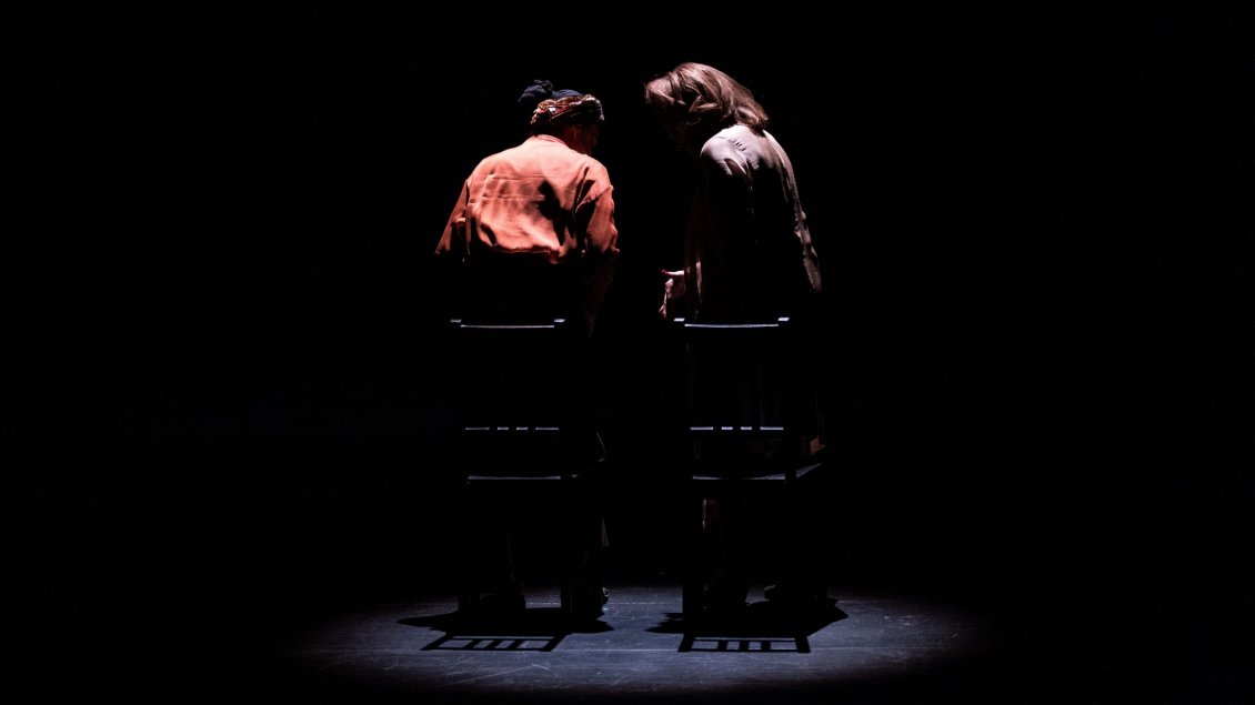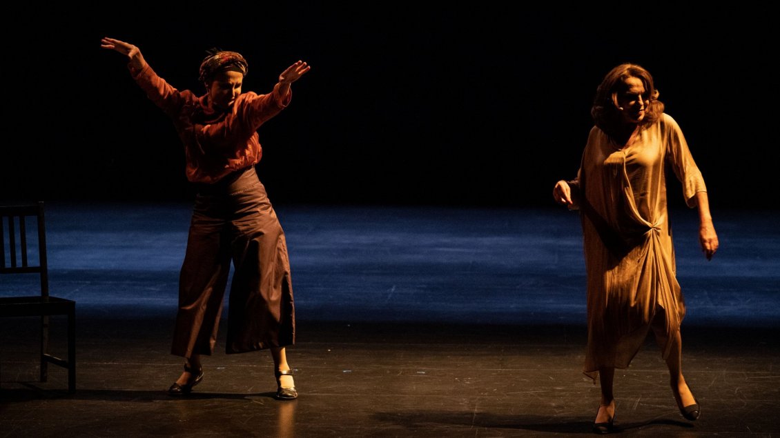 Avec Augures ce n’est pas seulement l’opportunité de découvrir une autre histoire du théâtre qui est proposée, c’est aussi, de manière infiniment subtile, la rencontre avec une autre tradition théâtrale, où le corps n’aurait pas disparu comme dans le théâtre occidental, corps ici modelé par la danse, la pantomime, le masque, agi et stylisé poétiquement tout comme la voix, non réduite à une imitation naturaliste, capable de chanter et de déclamer. Il y a une beauté immédiate, qui ne nécessite aucune traduction, dans cette présence entière qui dessine un geste et sait porter l’ineffable. Comme cette prière chantée dans un abri, mère et fille sous les bombes, tête de l’une posée sur les genoux de l’autre, comme cette marche chaloupant de vieille femme entre les rangs d’un théâtre. Ce portrait d’actrices, sous la plume et le pinceau de la mise en scène de Chrystèle Khodr, se forme tel un dévoilement, comme si ce qui avait nourri et modelé ces êtres de théâtre devait progressivement s’effacer pour laisser enfin apparaître ces êtres tout à la fois fragiles et pugnaces que leurs brillantes carrières artistiques pourraient occulter. Dans une bouleversante anaphore, « à la fin ce qui reste », déblayant les décombres d’un milieu théâtral décimé, théâtres occupés désormais par une chaîne de restaurants, par une agence de voyage low-cost…, Chrystèle Khodr nous signifie que les acteurs en sont la vivante mémoire. Et que le théâtre est, comme nous le rappelait Maxime Kurvers avec sa Naissance de la tragédie, essentiellement témoignage, rappelant aux vivants les morts qui les précédèrent, que le théâtre ne saurait être une table rase, que sa divination réside justement dans sa capacité à raconter et faire vivre le passé. De là cette émotion qui nous remplit et nous submerge tout au long d’Augures, ces deux actrices telles deux vestales, primesautières et dignes, graves et rieuses, magnifiques, contrastées comme l’histoire qu’elles traversèrent, et enfin cette évidence : si la guerre instaure la partition d’un pays, d’une ville, c’est alors au théâtre de déployer et jouer cette autre partition, texte de douleur et de courage, poème de vie, et par ce geste même, essentiel, et pourtant inutile s’il s’agit de changer le monde, pour le moins de lui trouver un sens humain. Et de partage.