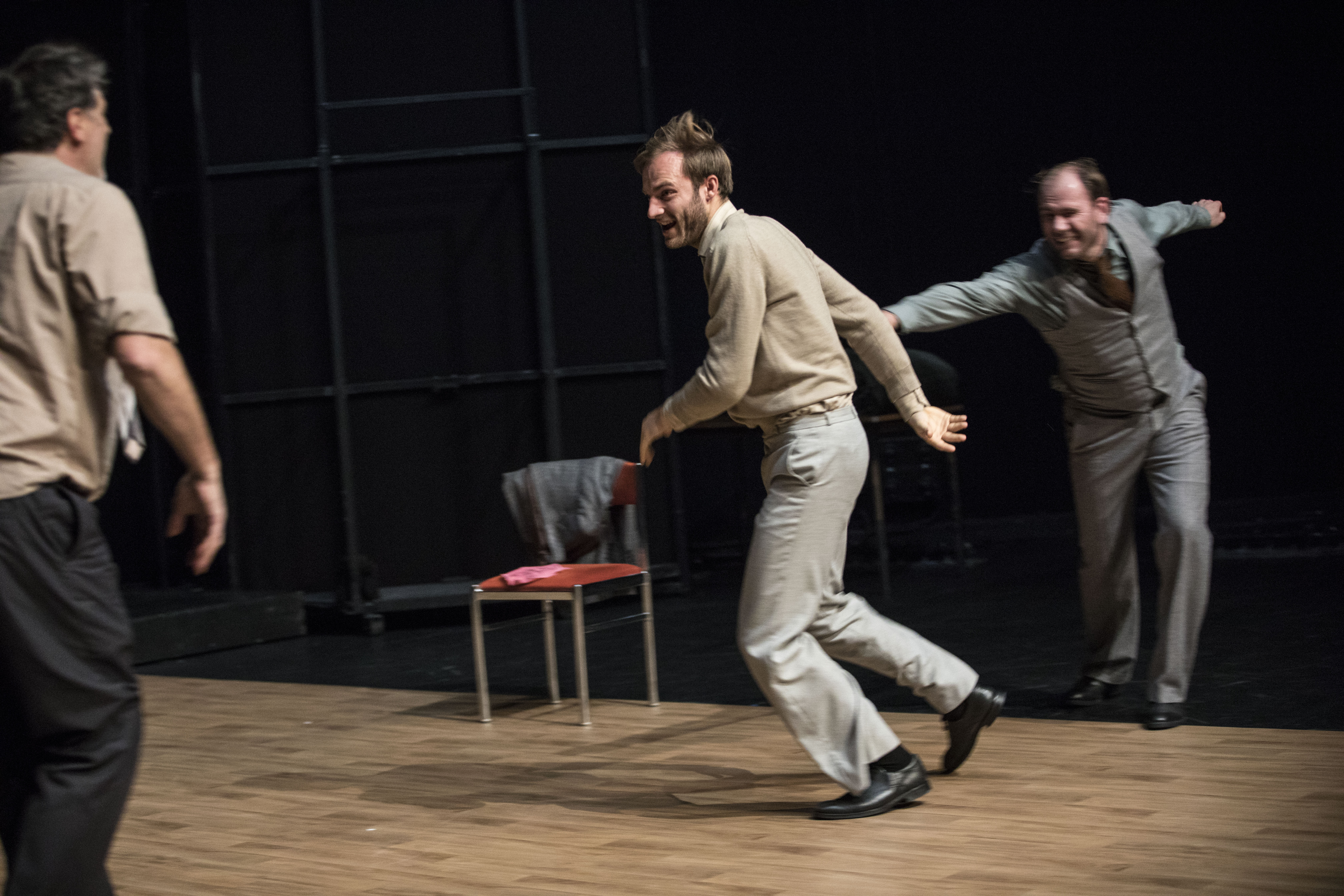 Aux éclats… est un projet entamé en 2019 lors d’un chantier de recherche dans ce même Théâtre de la Bastille (« Occupation » est le nom donné à ce processus par son hôte). Après avoir été créé dans un autre lieu, Aux éclats… revient donc inaugurer la nouvelle saison de la Bastille. Porté par trois magnifiques acteurs formant trio alors que le burlesque nous avait habitué au duo (Laurel et Hardi) ou au solo (Charlot, Buster Keaton…), le trio est probablement le grain de sable qui fait déraper un peu plus loin la mécanique et la mathématique naturelles du couple comique et l’entraîne dans des territoires existentiels, cruellement drôles, plus rarement explorés. Ce « trouple » donc, parfait, cravatés et habillés comme s’ils sortaient tous les trois d’un film de Tati, délicieusement vintages, mêle dans une combinaison inédite le premier de la classe, respectueux des règles, le donneur d’ordre, leader naturel et dominant, et la bonne pâte qui sait encaisser les baffes mais sait aussi en mettre.