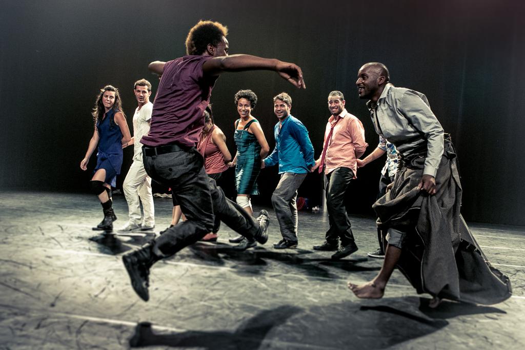 C’est un saut en l’air qui ressemble à un cri. T-shirt blanc et crâne rasé, un danseur zèbre la scène du 104 par ses sauts vertigineux. Au milieu d’une troupe qui mêle joyeusement danse, capoeira et cirque, il multiplie les performances physiques. Le sourire vissé au visage, on pourrait presque croire à sa bonne humeur. Mais l’entêtement qu’il montre à nous éblouir, par son énergie et son enthousiasme, traduit autre chose.