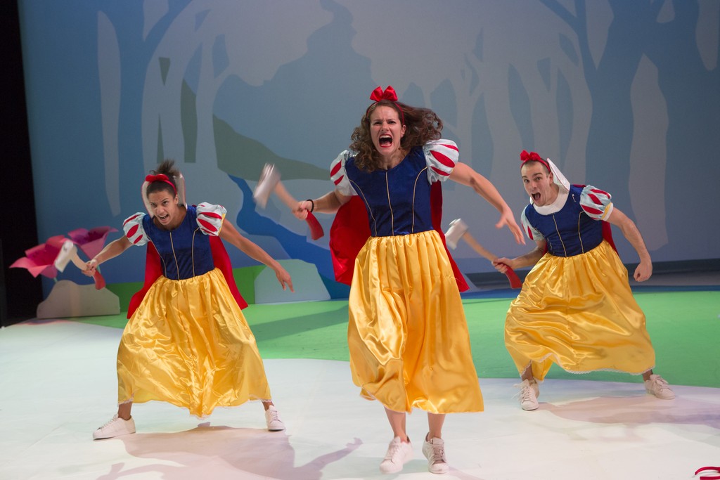 Ici, par un humour cinglant, on remet en question les modèles traditionnels imposés par les contes, les codes qu’ils inculquent et le recul qui manque face à ces histoires au goût d’enfance suranné. Laura Scozzi cherche alors à inverser les histoires, à les réécrire, à rendre les personnages de contes tantôt ordinaires, tantôt niais, absurdes, drôles, pousse leurs caractéristiques jusqu’à la caricature, avec pour seul but de faire une entorse au règlement. Naît de cette envie un spectacle énergique et moderne, qui provoque le rire et qui se permet tout, de la plus facile imitation grotesque de princesse Disney aux passages carrément absurdes de princes à cheval sans cheval. Ce qui est intéressant, c’est la simplicité – apparente seulement – de la création. La danse se déplace dans les corps comme un courant électrique, qu’on ne peut pas toujours contrôler, on se promène dans un décor de dessin animé en carton pâte, et il y a théâtre au moindre détournement, à la moindre chorégraphie. Sans être sérieux, moralisateur ou revendicatif, Barbe-Neige… saute pourtant à pieds joints dans l’écrin des contes pour en dire les absurdités, et faire des personnages des gens normaux, bêtes et méchants, sexy et susceptibles d’échouer.