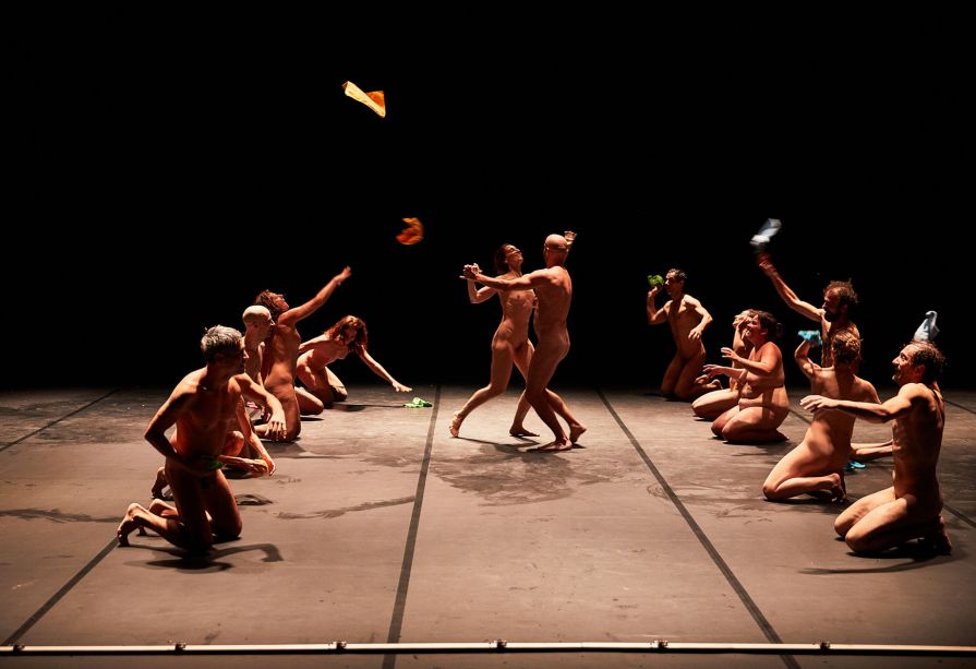 ils sont nus comme au premier jour de leur vie. Et muets. Le regard droit fixant la salle, pudique, fragile, soumis. Quelque peu désemparés sur ce plateau vide dont les issues leurs sont interdites. Quelques pétards lancés des coulisses les dissuadent vite d’en sortir. Peu à peu s’organise un étrange ballet. Des accessoires lancés sur le plateau ou descendus des cintres, bidons d’eau, poupées, boîtes à musique, ballons, serpillères, cacahouettes, balais… ils vont s’emparer, improviser, jouer. C’est une étrange humanité qui doucement émerge, s’organise. D’abord compacte, comme un seul homme, le chaos surgit bientôt et le groupe explose. Les différences se font, naissent les conflits, apparaît la solidarité. Etranges animaux que ces quatorze sur le plateau, à poil donc, perdant progressivement toute pudeur, s’exposant bientôt sans complexe, jouant de cette nudité comme un accessoire et dans un ultime sursaut refusent les vêtements jetés pour les couvrir enfin, et saluent ainsi dans l’affirmation de cette nudité qui les affranchit. Etrange création en fait où l’on ne sait pas très bien si c’est du lard ou du cochon. Entre provocation vaine et construction réfléchie, on est quelque peu partagé, dubitatif. On songe à Beckett, Acte sans parole I, où l’individu réagissait au stimulus provoqué par des accessoires surgissants sur le plateau, pièce ô combien radicale et désespérante. Avec Emma Dante, quoiqu’elle s’en défende, c’est bien plus joyeux et ludique. Surtout la nudité dans la création contemporaine, particulièrement dans la danse et depuis Isadora Duncan, est devenue un objet de réflexion qui voit le meilleur comme le pire. Là, sans être gratuit, sans être le pire, cela ne semble pas apporter grand chose de plus dans ce vaste mouvement. Non que l’on soit blasé ou pudique mais pour une création comme Tragédie d’Olivier Dubois, bien plus forte, ou mieux encore Jérôme Bel par Jérôme Bel, bien plus radicale, combien de pièces tombent à plat parce qu’affichant délibèrement cette nudité qu’elle affirme d’emblée comme un enjeux mais se trouve désemparé devant elle. C’est un peu à tout ça que l’on pense devant Bestie di scena. Ce n’est pas un mauvais spectacle en soi mais l’ambition affichée d’Emma Dante, « trouver la vérité d’un corps », ne fait pas mouche. On s’amuse, on rit, il y a des moments de grâce, parfois, mais cela ne suffit pas. La vérité d’un corps est ailleurs, pas toujours dans l’exibition frontale et contrainte. Du moins pas ici où le mouvement qui révèle fait place à l’agitation qui dissipe. Et cette contrainte actée on la perçoit, comme un défi imposé auquel on ne renonce pas malgré le risque de l’échec. Rien de plus fragile que la nudité sur un plateau par le regard qu’on lui porte. Et qui peut se retourner contre elle. Le premier regard d’Emma Dante, elle le dit, fut de la gène devant ces acteurs nus. Bien plus nus que mis à nu. Et c’est ce regard-là que l’on perçoit, cette gêne, malgré la magnifique impudeur des acteurs. Et c’est cette mise à nu plus que leur nudité que l’on aurait souhaité découvrir davantage. Ce qui peut sauver néanmoins et malgré tout cette création c’est l’innocence, feinte ou réelle, que l’on perçoit sur le plateau. Un goût de paradis perdu, même si un peu toc, d’enfance retrouvée, même si c’est faux. Ce n’est pas si mal et désamorce toute polémique, tout scandale et malheureusement toute réflexion…