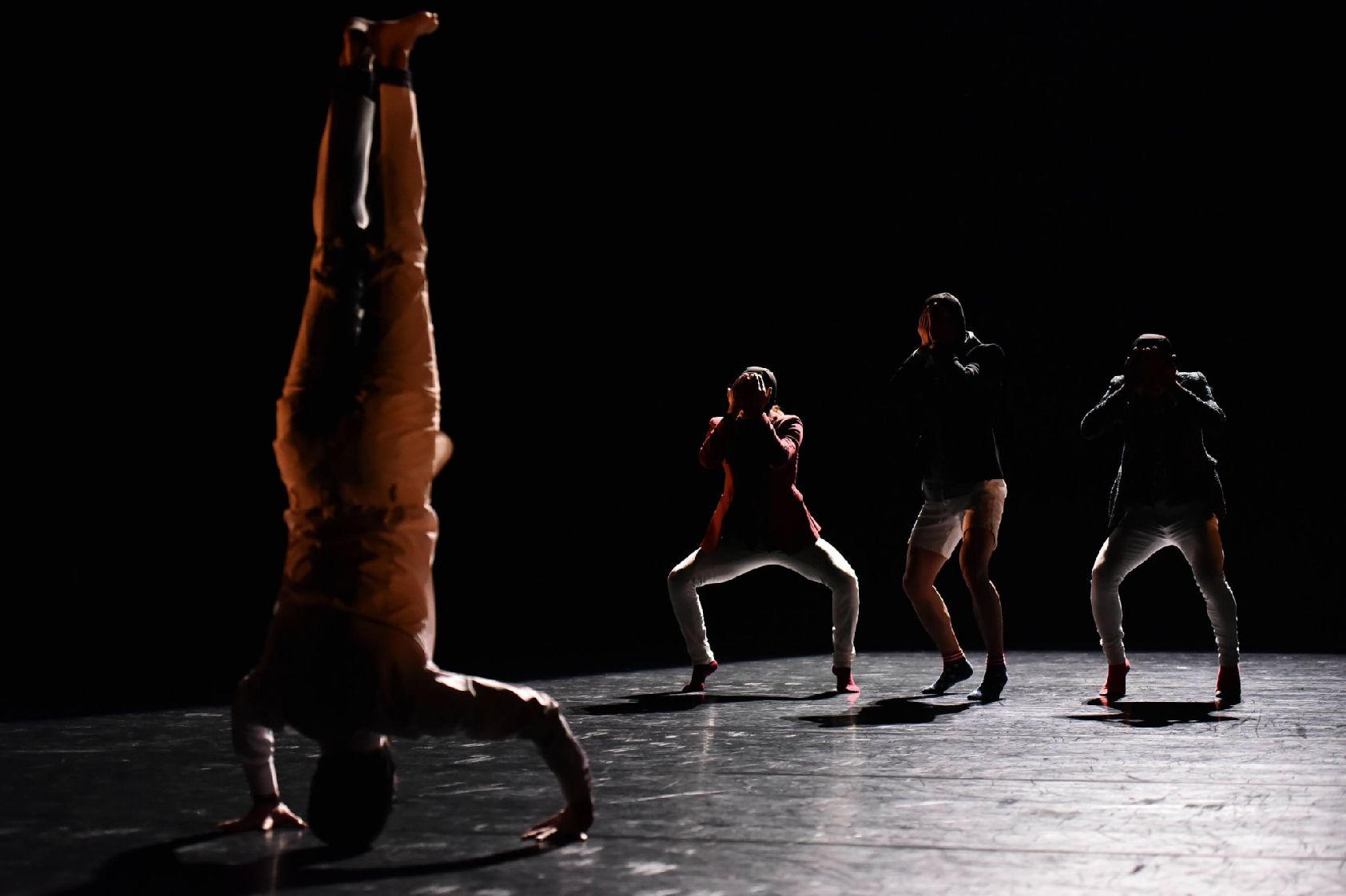 Dans une dizaine de tableaux chorégraphiques composés comme une succession de danses diverses et toutes aussi explosives les unes que les autres, les sept performeurs virevoltent en solo, en duo ou en groupe. Si on risque au départ d’être quelque peu déconcerté par ce patchwork décousu, on entre toutefois dans la proposition tant les danseurs nous étonnent par la maîtrise de leurs corps, dans des mouvements tantôt fluides, tantôt saccadés, et toujours expressifs et explosifs.