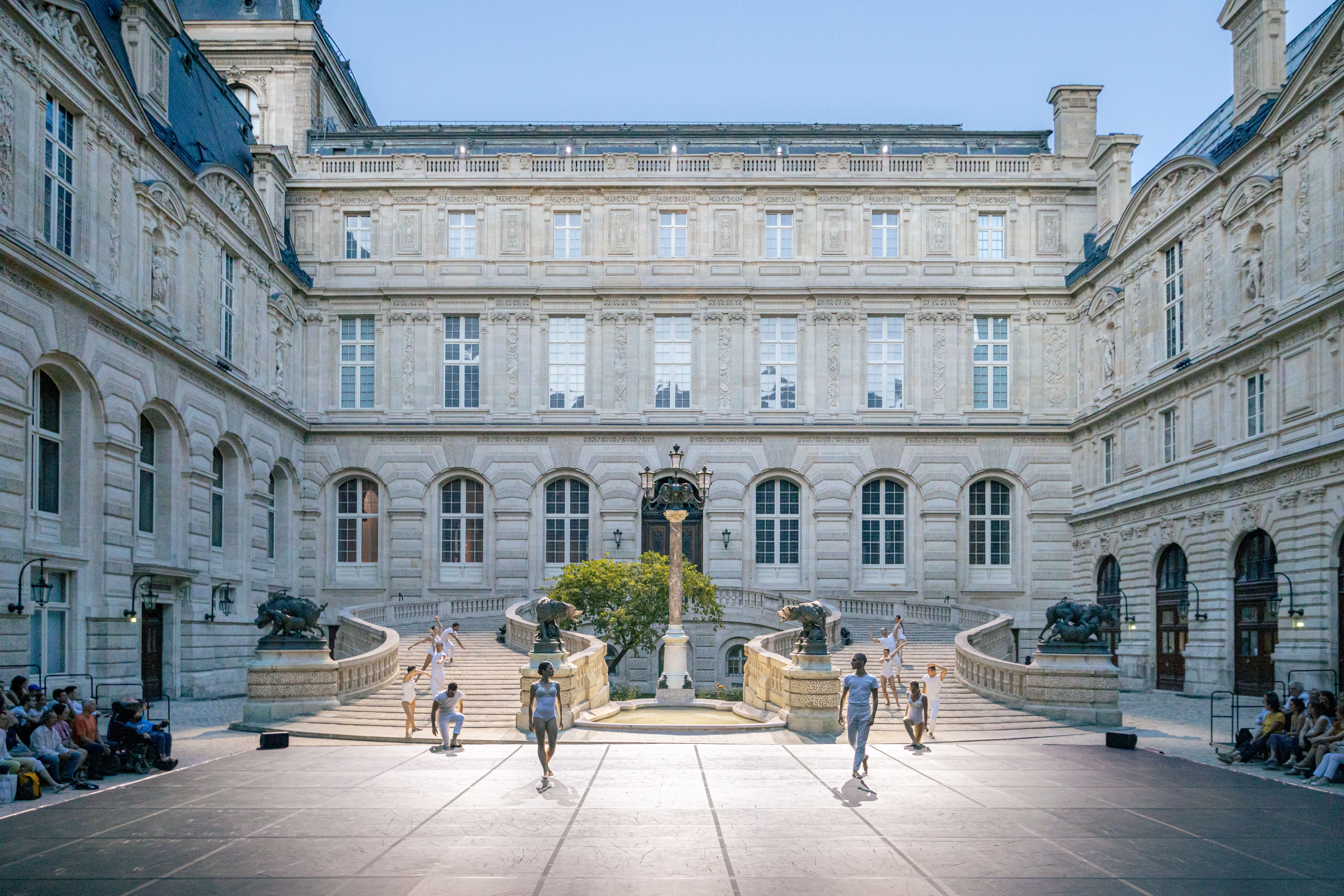 Tout d’abord le bonheur un peu perfide de pouvoir se promener dans quelques salles ouvertes du Louvre, un mardi, en plein été, des salles quasi vides où les visiteurs tournoient autour de splendides sculptures antiques : le torse de Milet, Les Trois Grâces ou la Dame d’Auxerre se la coulant douce pendant cette jolie soirée toute calme. « Tiens, du monde un mardi soir, mais que font-ils là ? Dehors !!! » Alors nous avons sagement obéit aux ordres de ces jolies petites merveilles marmoréennes de l’Aile Denon pour rejoindre très sagement aussi… une cour habituellement interdite au public, la Cour Lefuel, et assister à une autre merveille, plus récente certes puisque créée en 2018, le Boléro d’Angelin Preljocaj.