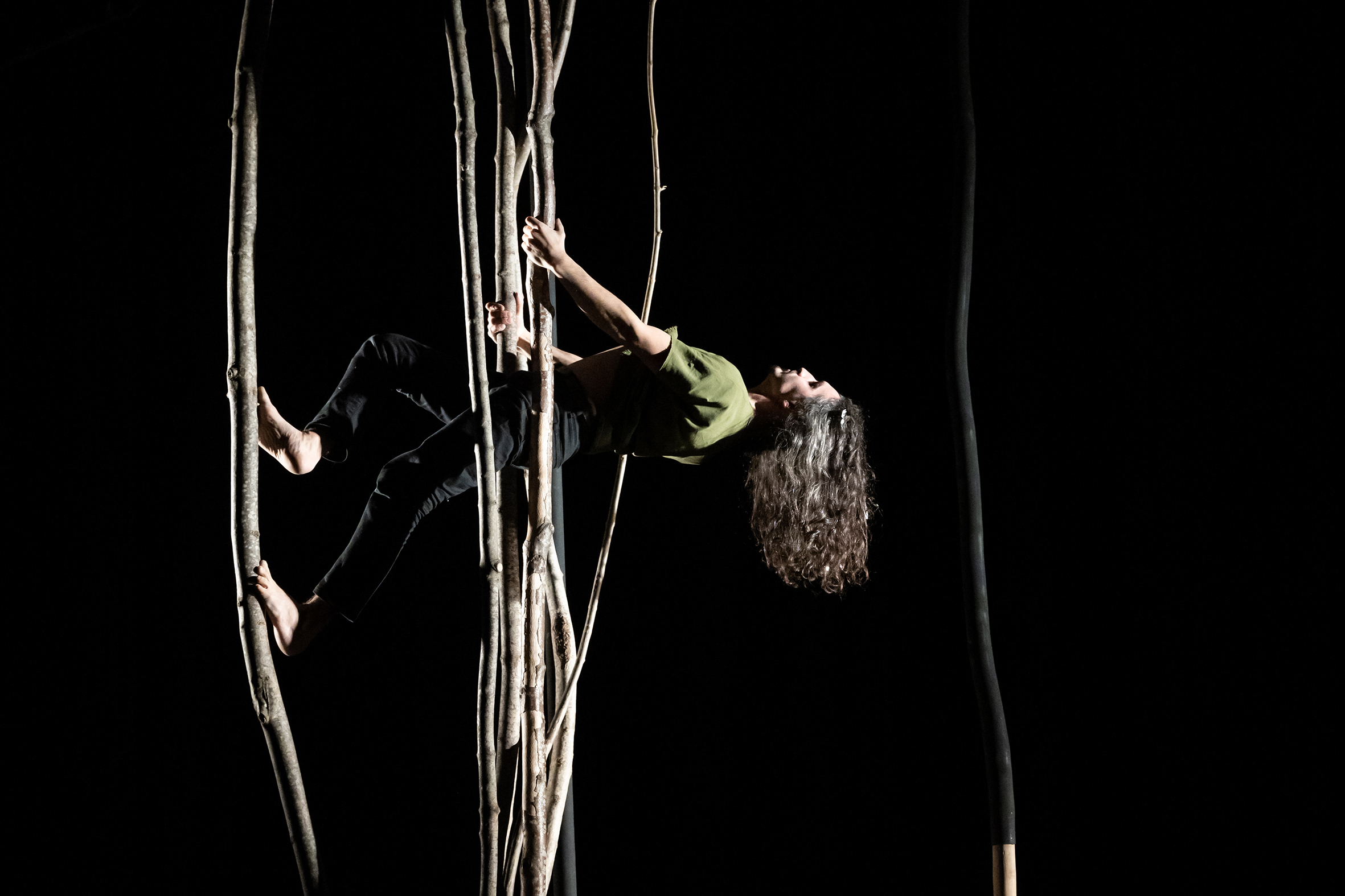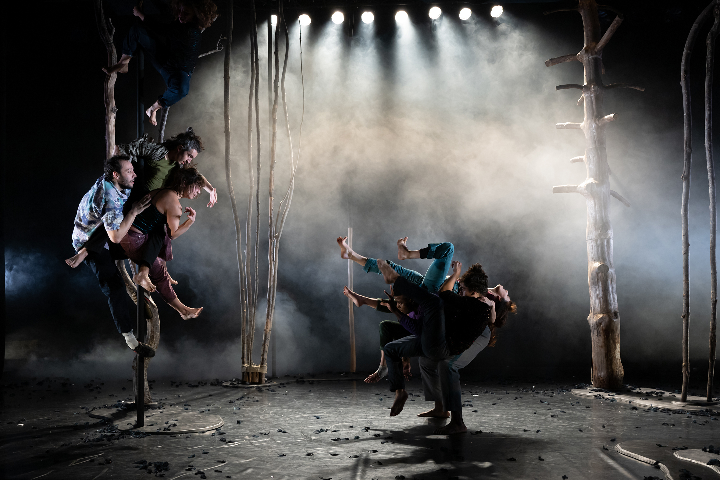 Pour ce faire, elle plonge ses huit interprètes dans un décor semé de lignes verticales : cordes, mâts et troncs, qui n’est pas sans évoquer une forêt, et qui va devenir le terrain de jeu de ces corps d’humains redevenus animaux, aux mouvements déconcertants de légèreté, de souplesse et d’énergie vitale. Les agrès de cirque sont donc ici au service de ce décor naturel et boisé, ce qui apporte une touche à la fois esthétique et originale au spectacle. Dans une chorégraphie fluide faite d’acrobaties, de portés, de contacts, de chutes et d’envols, et sur une bande son allant de The Do à Kae Tempest, les corps, les couples se lient, se délient, forment des groupes, parfois même des masses inattendues. Les corporalités proposées sont vraiment impressionnantes, et poussées à l’extrême grâce à une véritable maîtrise ; que ce soit la mollesse du corps ou au contraire son côté bondissant. Dans les stratégies de séduction mises en place, le lâcher-prise n’est jamais loin, et c’est un peu comme si ces huit circassiens avaient accepté de se laisser observer dans leur milieu naturel. Le tout constitue un spectacle fascinant, et c’est finalement nous qui nous retrouvons totalement séduits !