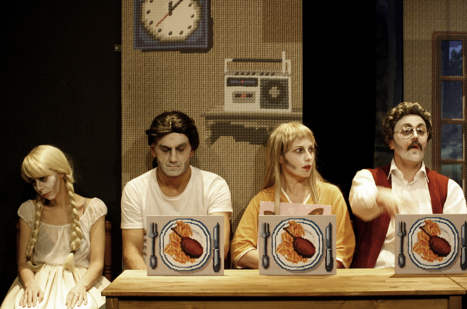 On pénètre dans le quotidien gras et poussiéreux des Cadouin par la cuisine et les scènes de bals populaires. Oui, les Cadouin sont modestes, « popu », cyniques et vulgaires. Mais tellement humains. Gare aux bien-pensants qui trouveront, sans doute, la pièce manichéenne. Cette écriture est dérangeante mais vraie, ne nous voilons pas la face. La scénographie de Quentin Defalt accentue la vulgarité et le décalage par la mise en place de panneaux et d’accessoires sur toiles imprimées. Rien de superflu. Seuls les personnages et leur horreur demeurent. Le choix du maquillage des clowns noirs tient le même rôle de focale sur la noirceur des personnages. Ces masques funéraires, présents dans tous les spectacles de la compagnie Teknaï, impulsent du surréalisme à leurs pièces et donnent un fil rouge : la solitude et l’angoisse de la mort. La mise en scène, l’expression des personnages et les textes (« Brita Baumann » et « Monsieur Martinez ») naviguent dans un univers particulier à rapprocher des Deschiens, légèrement décalé mais suffisamment proche, permettant ainsi l’empathie. De même que dans le premier volet « Monsieur Martinez, » présenté au Rond Point, le rire est présent. Qu’il est difficile d’accepter de rire de la détresse des autres, mais encore une fois, le rire est humain et salvateur.