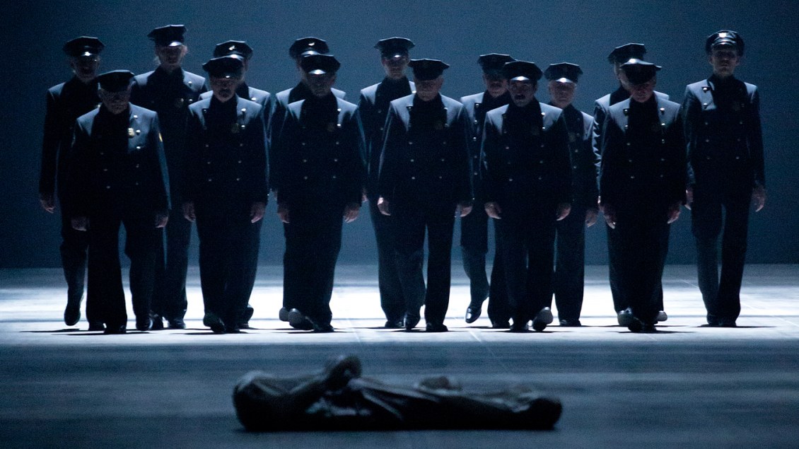 Castellucci indique avoir réuni sur le plateau dans Bros, « un groupe d’hommes anonymes pour questionner notre rapport à la loi et la responsabilité individuelle ». Cette seule indication interroge triplement, après avoir assisté au spectacle. Tout d’abord que veut dire anonymes ? En quoi des hommes sont-ils anonymes ? L’artiste n’a-t-il pas voulu dire anonymisés ? De fait, il serait difficile de les singulariser, en tout cas pour la majorité d’entre eux qui n’ont pas de rôle particulier et qui font partie du groupe de policiers en uniformes, qui se ressemblent beaucoup, comme des frères (« bros » est la contraction de « brothers ») à quelques exceptions près. Ensuite, pourquoi des hommes au sens restrictif d’êtres humains masculins ? En quoi des femmes ne pourraient-elles se fondre dans le groupe susmentionné ? Existe-t-il une raison objective à leur exclusion ? Enfin, est-ce « notre » rapport à la « loi » qui est questionné ou notre rapport à l’ordre, à l’autorité et les ressorts de la soumission et l’obéissance ? Est-ce qu’en évoquant la « responsabilité individuelle » Castellucci veut se placer dans la filiation de la « responsabilité personnelle » d’Arendt ? Plus les minutes s’égrènent, plus on a l’impression, notamment durant les scènes de torture, que c’est en effet de ce concept controversé de « banalité du mal » qu’il est question. Mais n’est-ce pas trop évident ?
