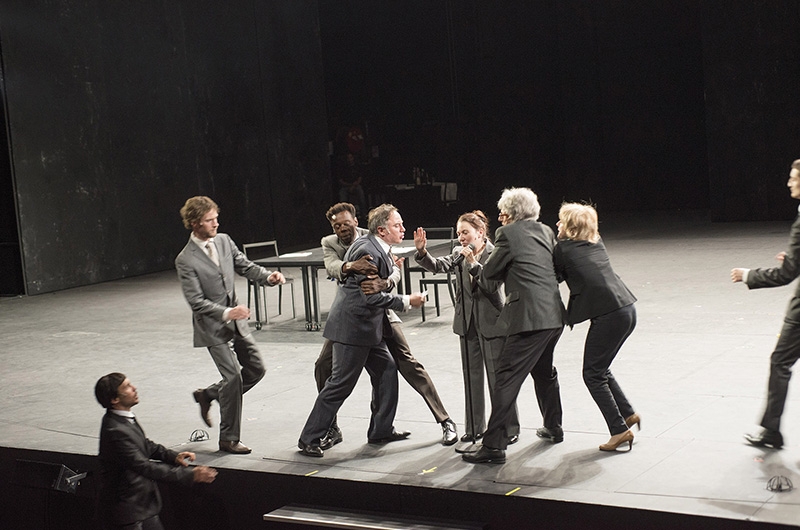 Comment le clergé en est venu à voter la nationalisation des biens de l’Eglise ? Comment la noblesse a accepté de siéger dans une même assemblée que le tiers-état ? Pendant 4h20 le metteur en scène Joël Pommerat nous plonge dans l’atmosphère incandescente des premiers mois de la Révolution Française. Les oppositions entre le tiers-états et la noblesse, entre Montagnard et Girondins, s’avèrent être les moteurs de la pièce. Le spectacle progresse ainsi au gré des évènements historiques, on reconnaît facilement le renvoi de Necker ou la prise de la Bastille. Ce n’est toutefois pas la véracité historique qui semble avoir intéressé le metteur en scène. A aucun moment les noms des protagonistes de l’époque ne sont cités, à l’exception du roi lui-même. Cette abstraction dans laquelle baignent les débats permet de mieux souligner les oppositions fondamentales qui structuraient la société de l’époque, de souligner deux conceptions de la France antagonistes. Mais loin des discours politiques interminables que l’on pourrait craindre, « Ça ira (1) Fin de Louis » se révèle une pièce fascinante sur la politique et sa mécanique.