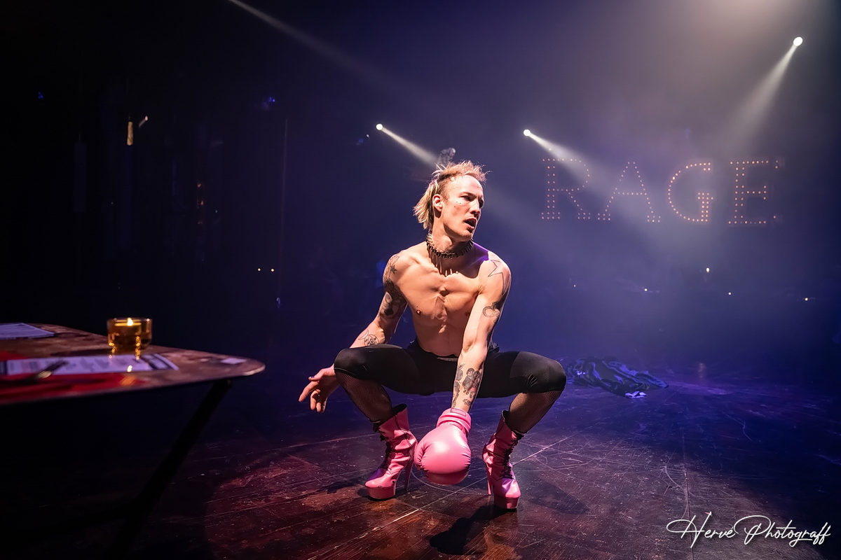 « La rage contre une histoire sans fin, plusieurs histoires. Un cabaret au-delà des limites et des genres, le Cirque Électrique (se) rassemble. Encore une fois, on va pas déconner : Cirque, Sexe’n’Freaks & Rock’n’Roll ! » : difficile de ne pas mieux commencer avec les mots mêmes du Cirque Électrique au sujet du Cabaret Décadent, revue électrique n°25 + 45 revue qui dure encore quelques semaines dans cet endroit magique et intemporel, étrange et fascinant qu’est le Cirque électrique. Sous ce chapiteau rouge, le public s’installe peu à peu, dîne, boit, discute, sans presque voir passer, ici ou là, une étrange et belle silhouette portant une cagoule métallique. Comme ça, pour rien. Serveuses et serveurs sont adorables, même si deux, d’un seul coup furieux, se jettent des assiettes à la figure. Et juste un peu plus tard, grand noir, musique et tout arrive, Otomo de Manuel, jouant le maître de cérémonie, chevelure rose et bouclée, synthétique et paradisiaque, tatouages et résilles trouées, lance le jeu vautré sur un canapé Chesterfield, surplombant le public.